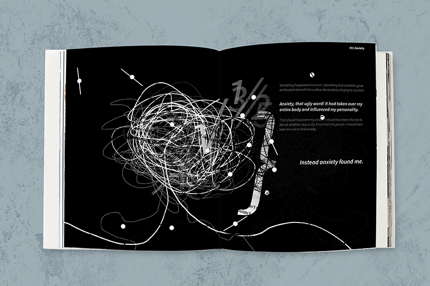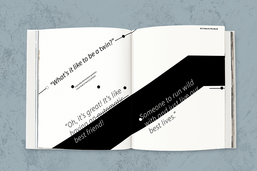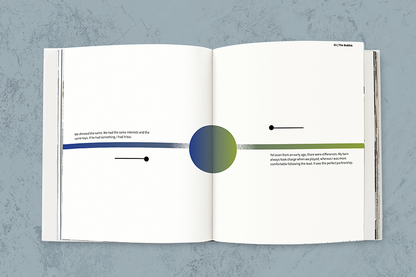 a feeling of invisibility began due to people not treating twins as separate people. This resulted in a deep-seated anxiety that persists to this day. This shift in emotion provides contrast throughout an A5 sized book, which reflects a personal diary.