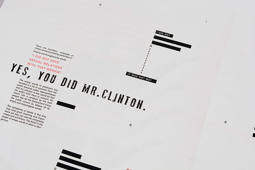 This project is an exploration of the sometimes infuriating blandness of language and demonstrates some of the common verbal tricks and deceptions used by an array of manipulators, culprits, advertisers, hucksters, to name a few.