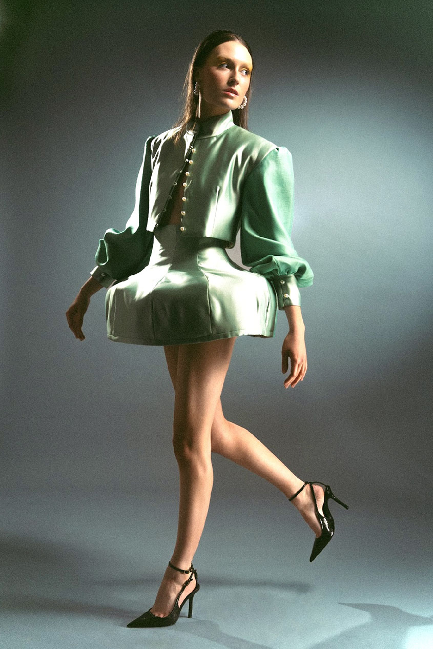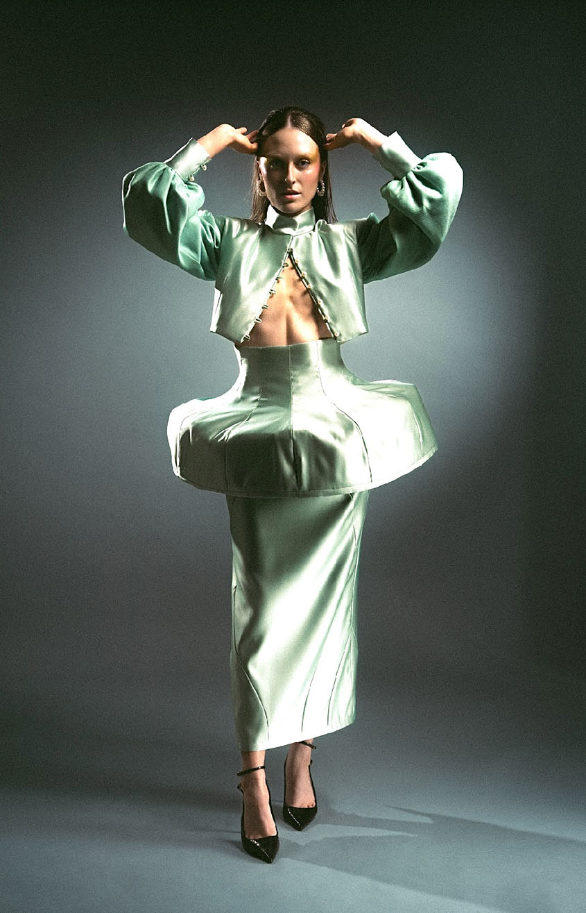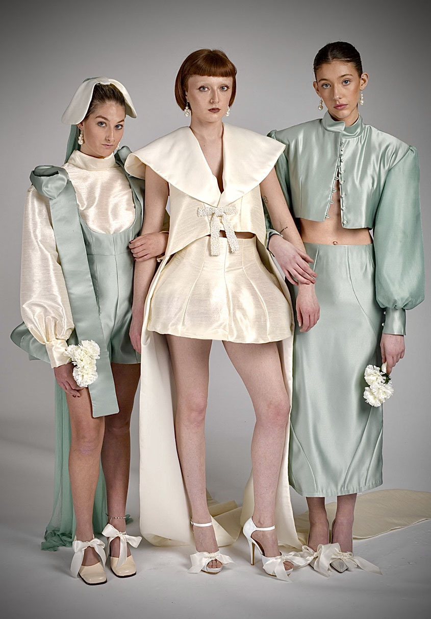 Áine’s graduate collection explores the marriage of her grandparent’s in 1960’s Ireland. Falling in love in 1960’s Ireland was a delicate dance, woven with the threads of tradition and the comings of modernity. Áine’s granny being a hairdresser and her grandad being a stained-glass artist meant creativity flew through the veins of them both. Áine has created a collection that morphs together the delicate details of her granny’s femininity and elegance, with the structural concept of marriage and being wife. She wanted the collection to be a testament to the strength, love and growth throughout her grandparent’s marriage. Áine’s design choices incorporate structural shapes and complex panelling which are heavily influenced by the intricate detailing within her grandads stained glass work. The fabrics she used are upcycled wedding dresses, silk chiffon, duchess satin and silk taffeta. The choice of fabrics were influenced by the old saying ‘something old , something new, something borrowed and something blue’ . The colours are a reference to her grandparents old wedding photos and also the colour sage and creamare neutral, calm, and relaxing colours which are associated with purity and elegance.