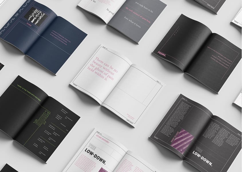Poetry is traditionally seen as something elitist, inaccessible and stuffy. This project focuses on challenging this visual perception of poetry as a means to make it something edgier, more accessible, and overall less cringy as an art form. The magazine ‘Poetry- Look Again’ has been designed to promote poetry aimed at young people, alongside a video promo, poster series and merchandise, in an effort to change the minds of those who hate it.
