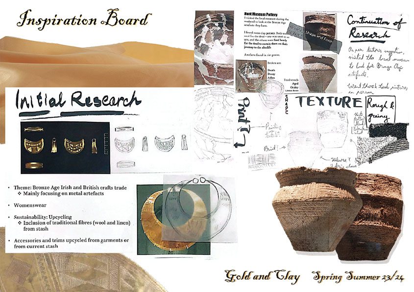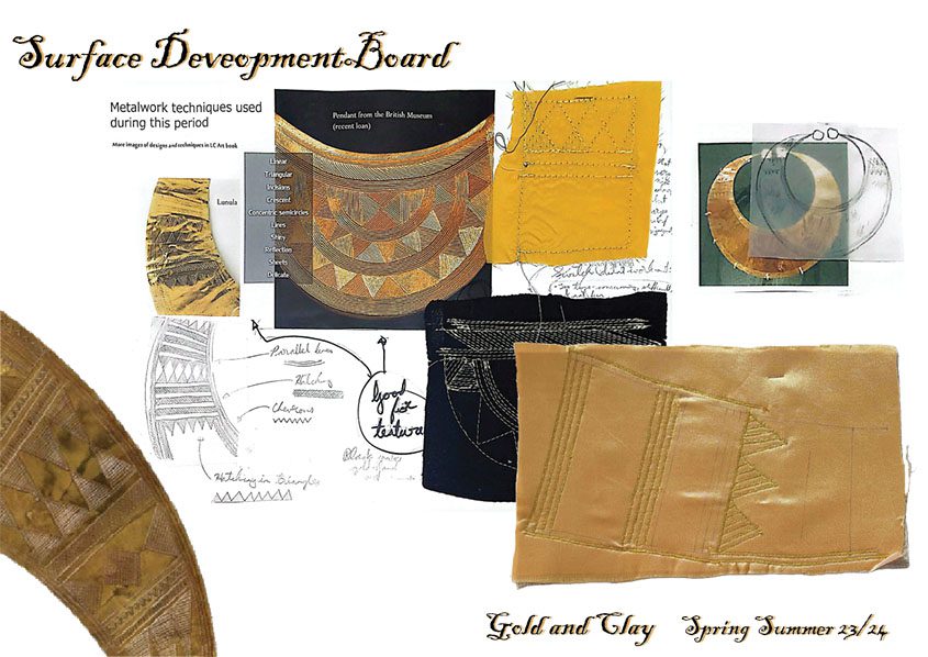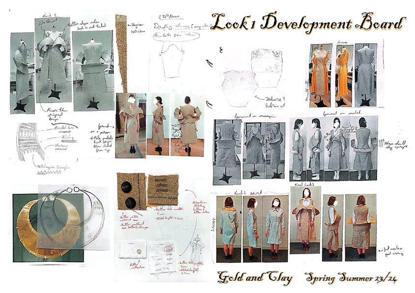 Shape and fabric choice are inspired by the jewellery and clay pots from this era, while the embroidery on each look is inspired by the metalwork embellishment techniques used on the gold artefacts.