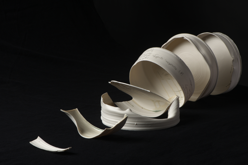 The bittersweetness of ■■■■■ expression is something that cannot be easily addressed in a single installation, but I have tried here to let you get some sense of what has been completely internal for my entire life. The rigidity of traditional ceramic process has been given freedom of expression, but only within its typical limitations. Delicate porcelain has been coaxed and cajoled and pleaded with into forms that move, that bend, that fracture, that fall to pieces, all in the pursuit of expressing the exquisite love I have for myself and ■■■■■■■■■, and the grief I feel for myself and ■■■■■■■■■. I have left the evidence of myself in every piece of this work, I ask only that you look in and find me.