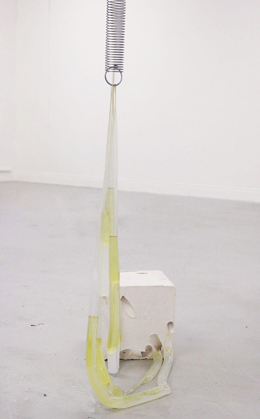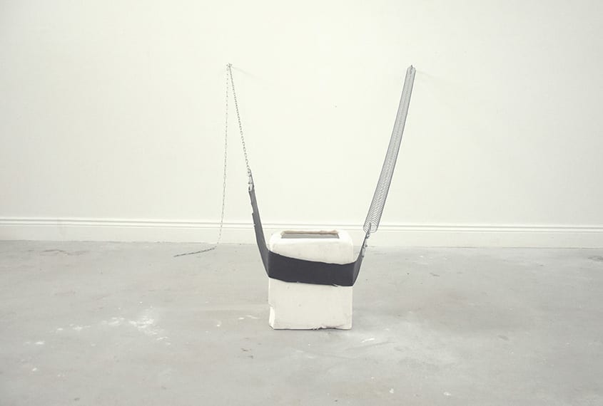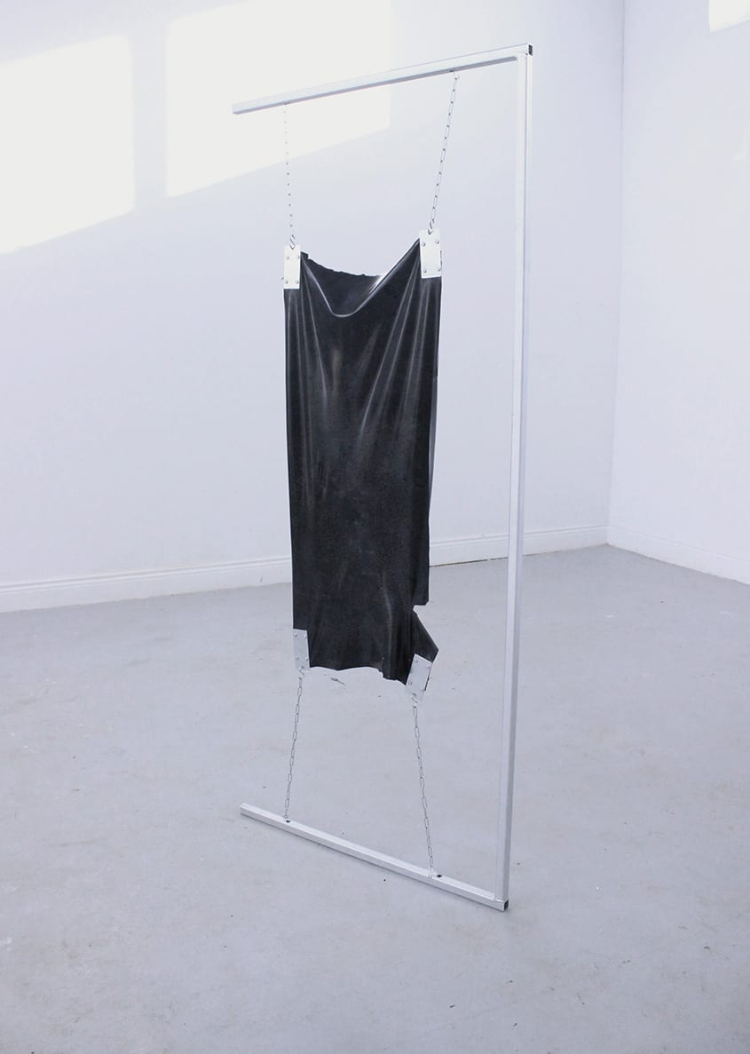 Tensely held in balance, the objects access time, space and gravity through the conflicts of materiality taking place. At times adherent at times resistant, the moment of encounter between sculpture and the body is weighted by a shared relationship to the systems of a physical existence.