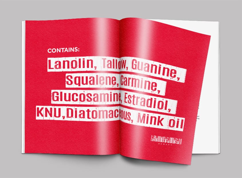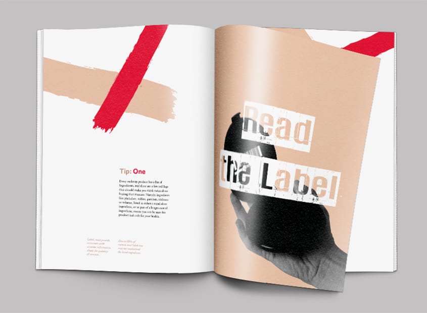 This project investigates and uncovers the various types of hidden ingredients found on the label of common cosmetic products that are disguised with scientific terms. The intention of the overall visual piece is to translate these findings with the use of visual and typographic elements. These include manipulated imagery and photography to clarify the distortion of reality with these products, along with protest typography.