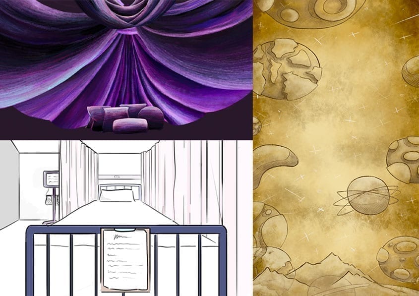 There are two different styles within the story, one is the little girl’s real world which for the most part is in full of colour. In contrast the imagines world uses a limited colour palette, with all the character animation in silhouette. I wanted the story world to feel hand drawn on paper.