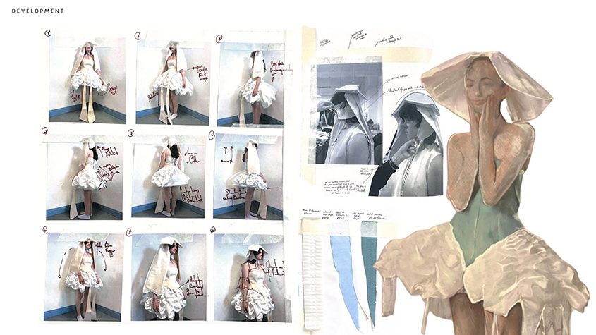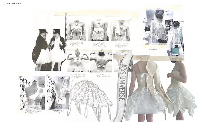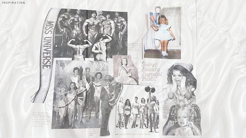 This collection is inspired by the hyperfeminine, obscure world of pageantry. Hyperfemininity is often characterised by superficiality. Utilising bows, ribbons, the colour pink with suffocating corsets; a glossy veneer that masks something darker, an unknowable identity. These exaggerated ‘feminine’ qualities strive for perfection. However, femininity is more than just an aesthetic or role, it is an essence of being. As a little girl, I often spent years trying to understand the distinction, deciding wether I should embrace who I am or claim more masculine traits to be more accepted. The idea of pageantry intrigued me due to the extreme beauty regimes and aesthetics that these young girls paraded, a reversal of the roles in the phrase ‘mutton dressed as lamb.’ By using visual signifiers of the hyperfeminine, such as ruching, bows and voluminous silhouettes, I developed feminine motifs throughout my garments, to challenge the distaste a general audience would have to the world of pageantry. I incorporated lingerie to intensify the uneasiness caused by the prematurity of pageant girls. want to start the conversation of pageantry intertwined into the fashion world through luxury garments. The soft and more acceptably feminine colour palette was used with the intention of neutralising some of the distaste for the hyperfeminine, allowing these girls to be understood without judgement.