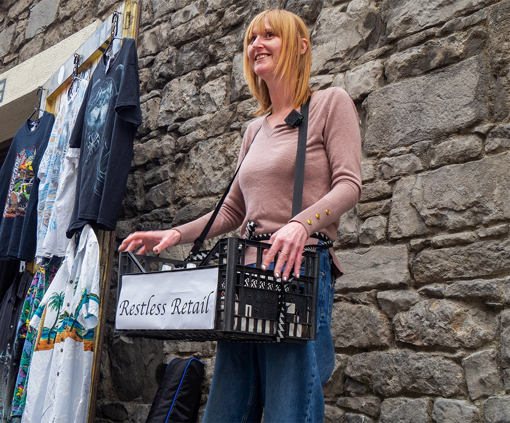 Restless Retail is a performance-installation that humorously transforms insecurity into fictional products like Shame Polish and Overthinking Mist. Set up like a market stall, I adopt a carefully controlled persona who actively tries to sell these absurd items—while also insisting no one really needs them. This contradiction reflects the mixed messaging of consumerism and self-help culture.