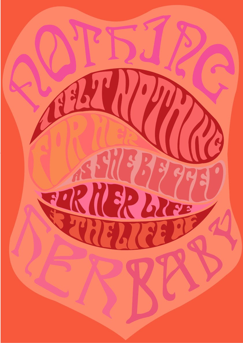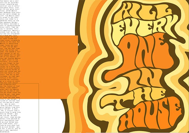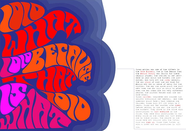 In my typographic approach I decided to look at quotes that she said while being on drugs and contradict that with the cold hard facts of what happened. While Susan was ‘using’ she said some horrific things about the murders and showed no remorse. For this reason, I designed her quotes in psychedelic hand drawn typography to show the mind set she was in at the time. Susan is also the reason the Manson Family were caught for their killings of some of Hollywood’s biggest stars, Susan bragged to her cellmate (while in jail for another conviction) about her part in the murder of Sharon Tate.