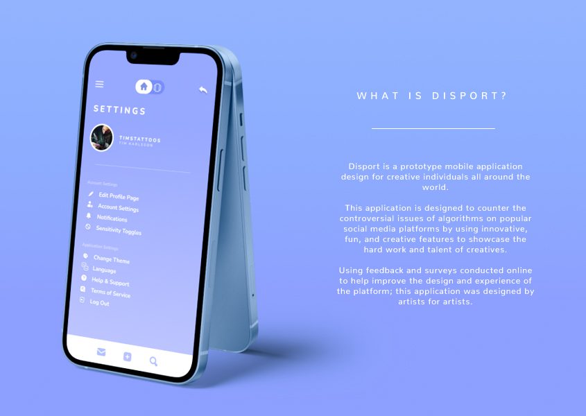 In the current state of social media, numbers signify your worth and popularity as an individual on the internet. Followers, likes, saves, comments, and views- that is what makes you worth it. Disport highlights your worth by your work and effort. The application is designed to counter the common algorithmic results of exposing content to users, by using a carousel feature that showcases recently posted content and can be refreshed by the will of a user at any moment to have new content to spot.