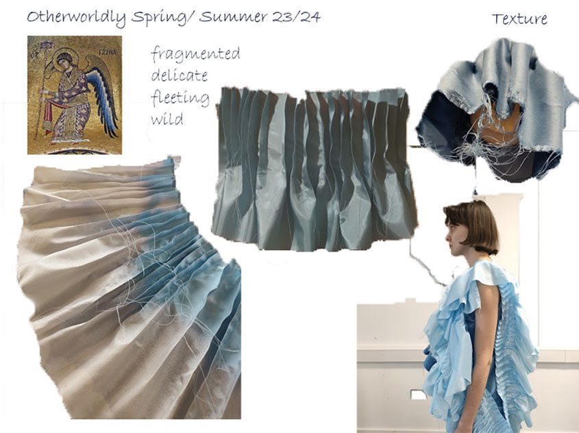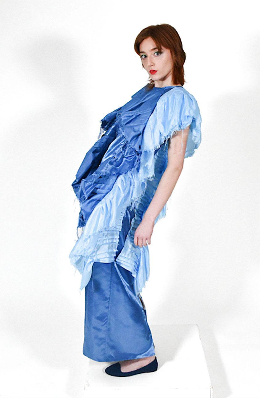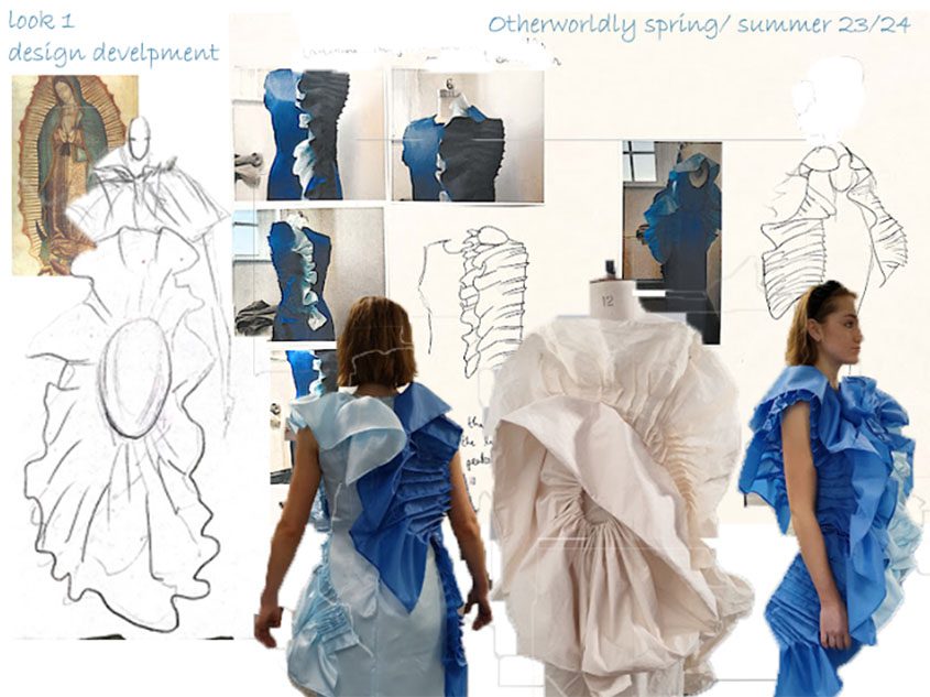 My collection titled “Otherworldly” is inspired by byzantine era painting and artwork depicting heaven and angels. The idea of floating and flying through the skies is portrayed through exaggerated ruffles and pleating techniques to make the wearer look as though they are rising into heaven. Shades of deep luminous blue fabrics are layered to portray a painterly opacity. The colour blue represents divinity and purity in byzantine era art. Shapes were derived from different variations of the Modano as she is portrayed in paintings.