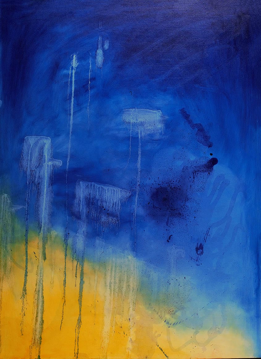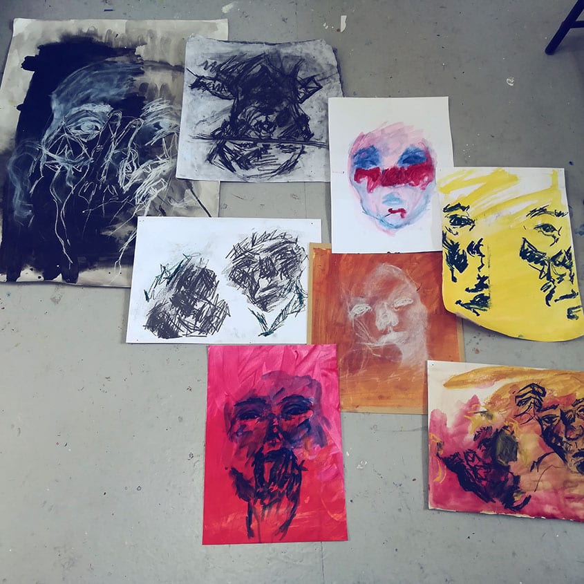 The imprint of bodily action is present in the work, the residue left from movement. The drawings and paintings interact and capture a sense of movement. Dualisms appear in the work between the pleasure in action and aggression that is played out in moments of anxiety, the absorption in work and the feeling of being watched. A performance in surveillance. This kind of self-awareness leads to an overload in sensory perception, the heightened awareness of temperature, the feeling of blood heating in your cheeks, of overheating and not being able to breathe. Feeling constricted.