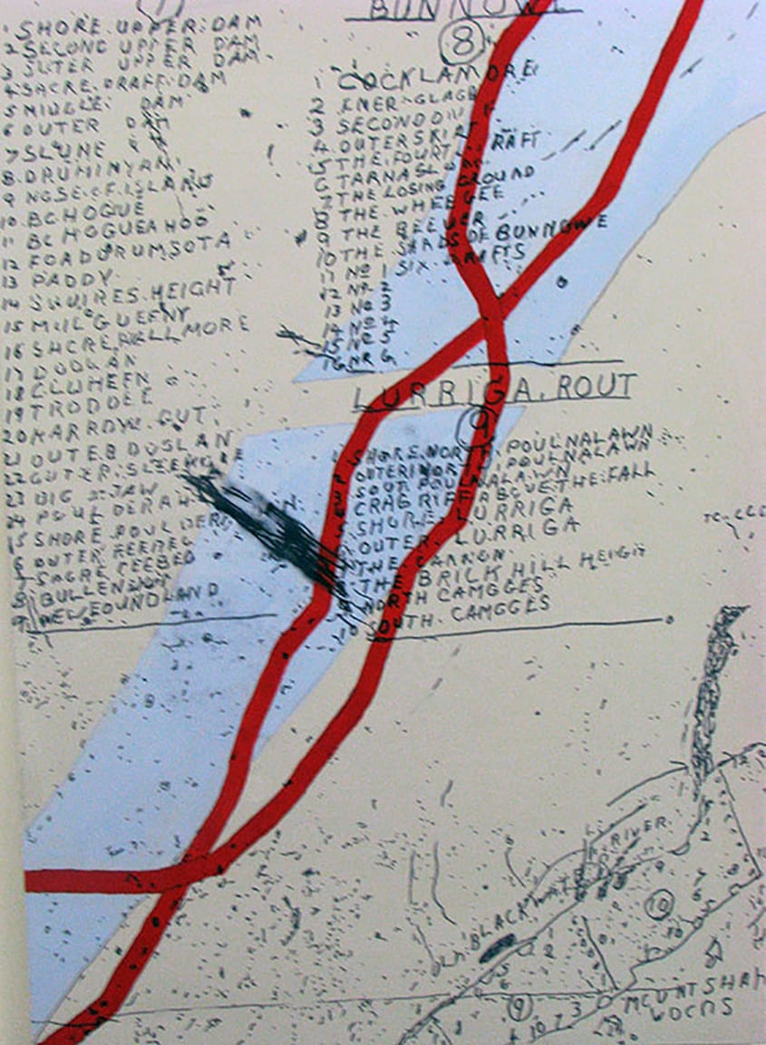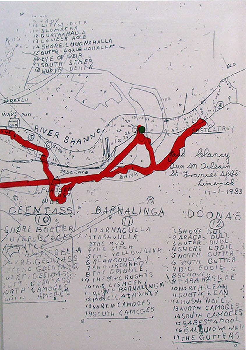 Anne Stewart’s work is informed by the making of community audio recordings. In so doing, Stewart came to understand their sense of identity and belonging, through their occupation and use of the river on a daily basis. Her work encompasses the use of G.P.S. systems, fisherman’s maps, video, artefacts and photography. Emphasising the sense of ownership, identity, culture, and the history that this community values.
