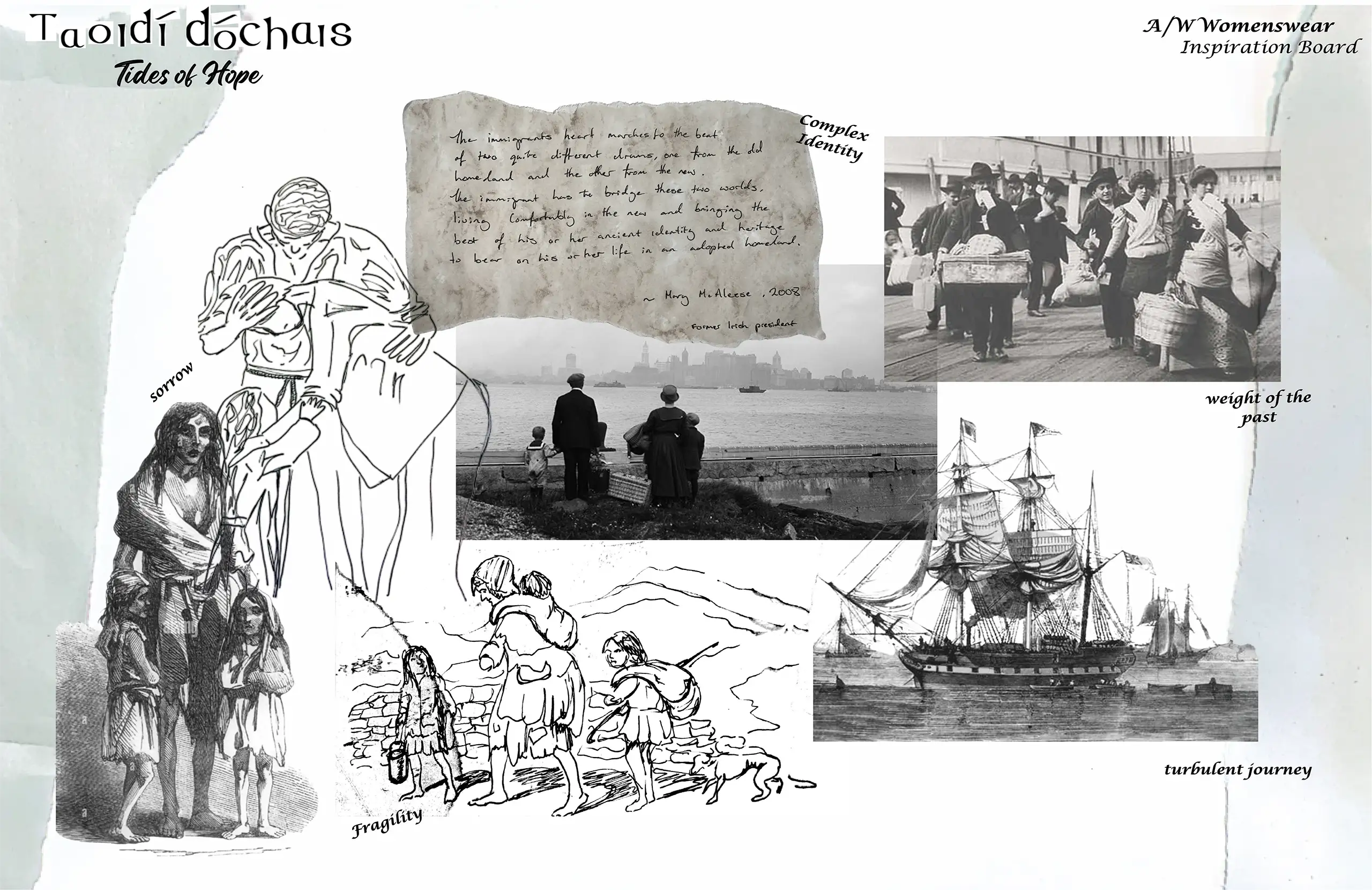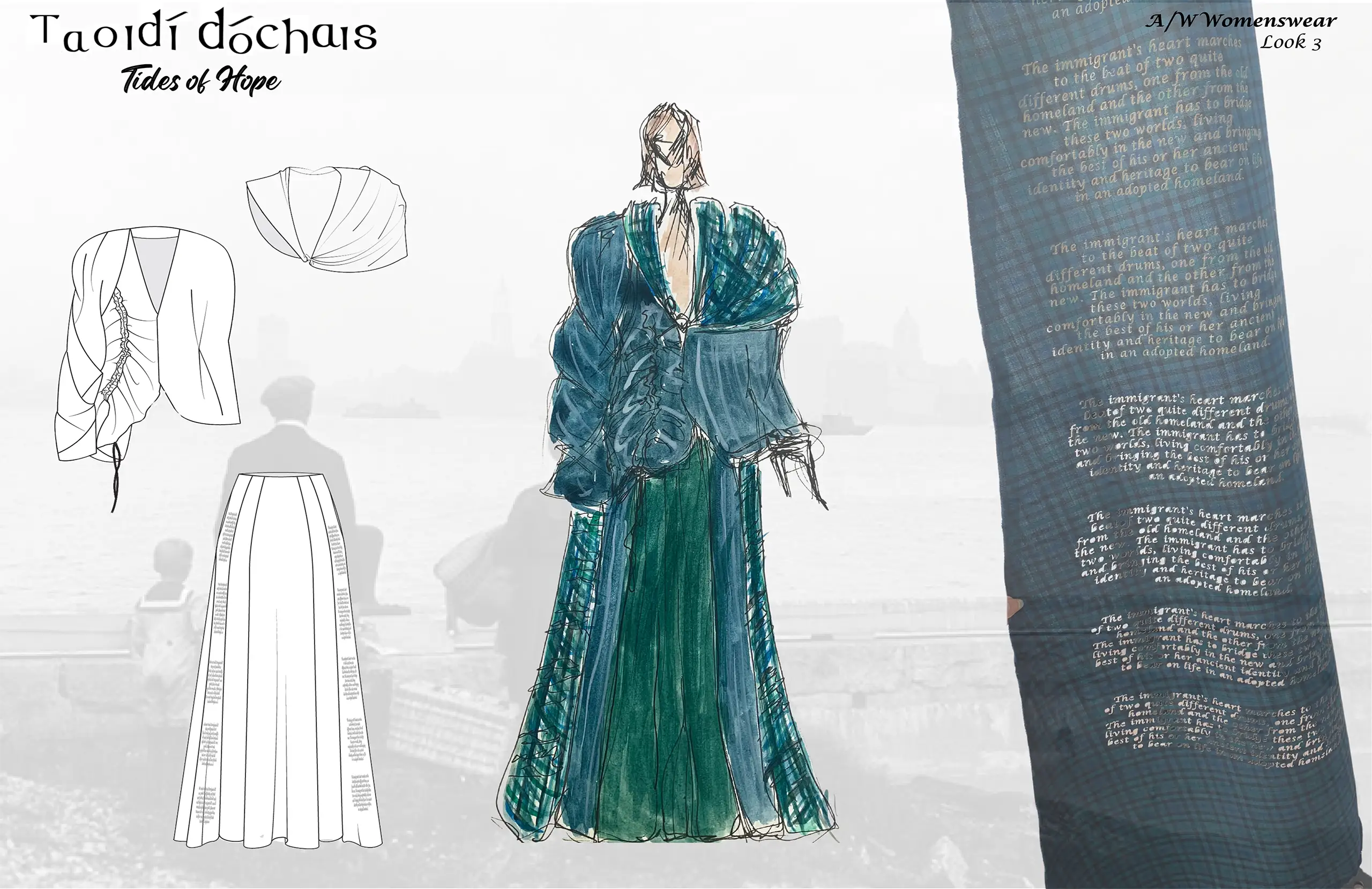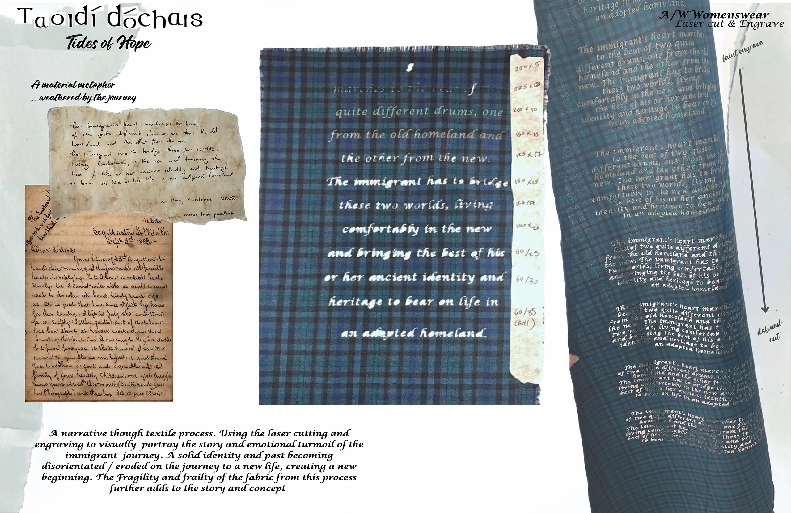 Inspired by the rich history of Irish emigration to America, my A/W womenswear collection reflects the emotionally and physically challenging journey of Irish immigration, which began with the Great Famine of 1845. With particular reference to New York, a city shaped by its Irish diaspora, my collection explores duality of identity, the pain of displacement, and the hope of a new beginning. Through my use of innovative techniques such as laser cutting and engraving, I created a visual narrative, with laser cut lace and written script, which alongside both fluid and chaotic drapery and tailoring, and asymmetric silhouettes, allowed me to convey the tension, fragmentation and fragility of the immigrant experience. My chosen colour palette captures the emotional weight of this narrative, drawing inspiration from national famine memorials in the west of Ireland, The shades of blue and green with rust orange, echo the Irish landscape while symbolizing sorrow, heritage and hope. The fabrics I used in this collection, mainly wool blend suiting, reflect Ireland’s rich heritage of working with wool fibres. This fabric allowed me to create my desired flow and drape, whilst also supporting my complimentary tailoring. Within my fabrics and colour story, I incorporated plaid and pinstripe patterns, drawing from both Irish heritage and the culture of New York. These elements contribute to the visual disarray, reflecting the complex identity of an immigrant. In all this collection is a reflection of our heritage and a homage to the resilience, complexity, and enduring spirit of the Irish immigrant journey.