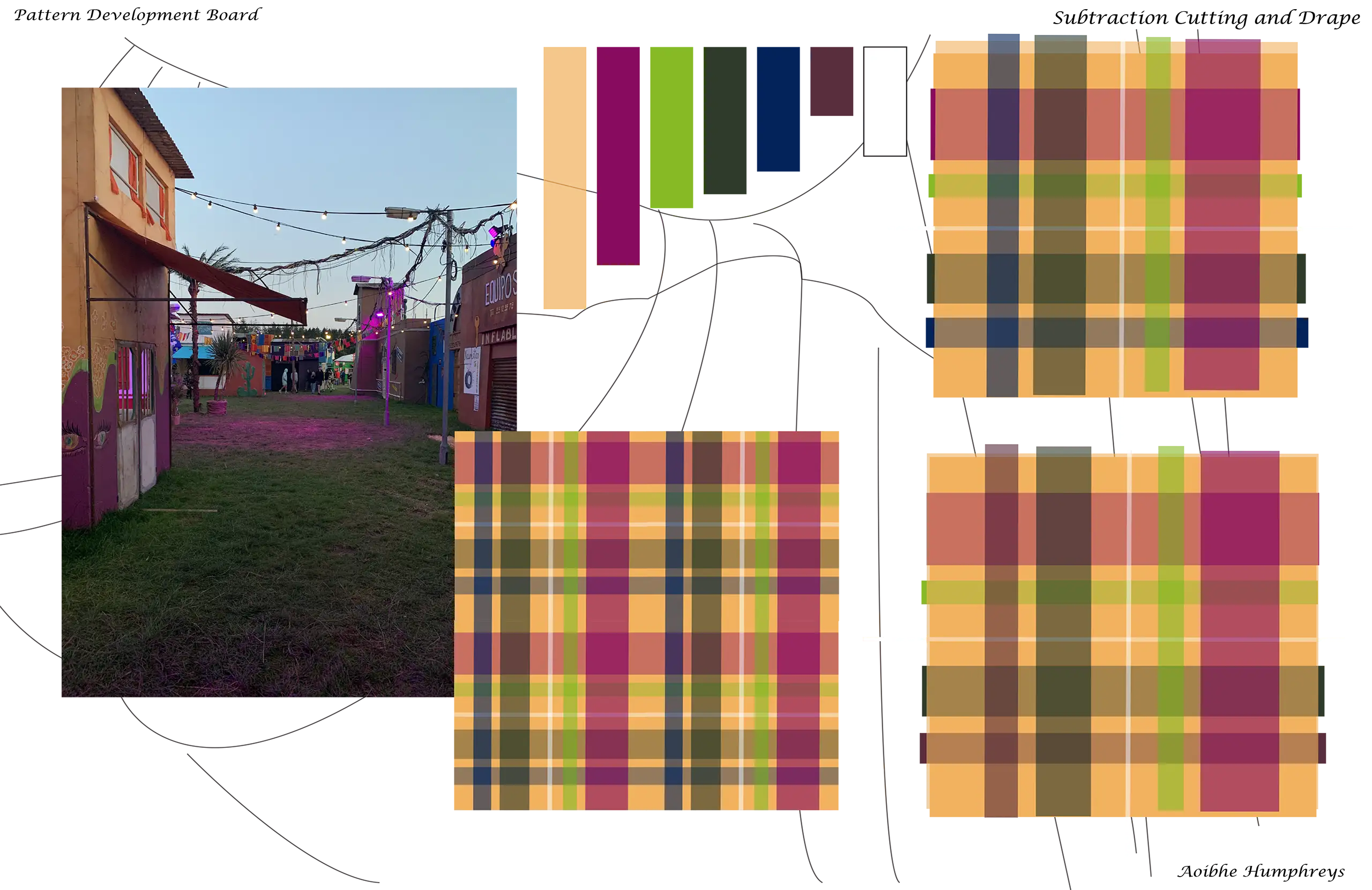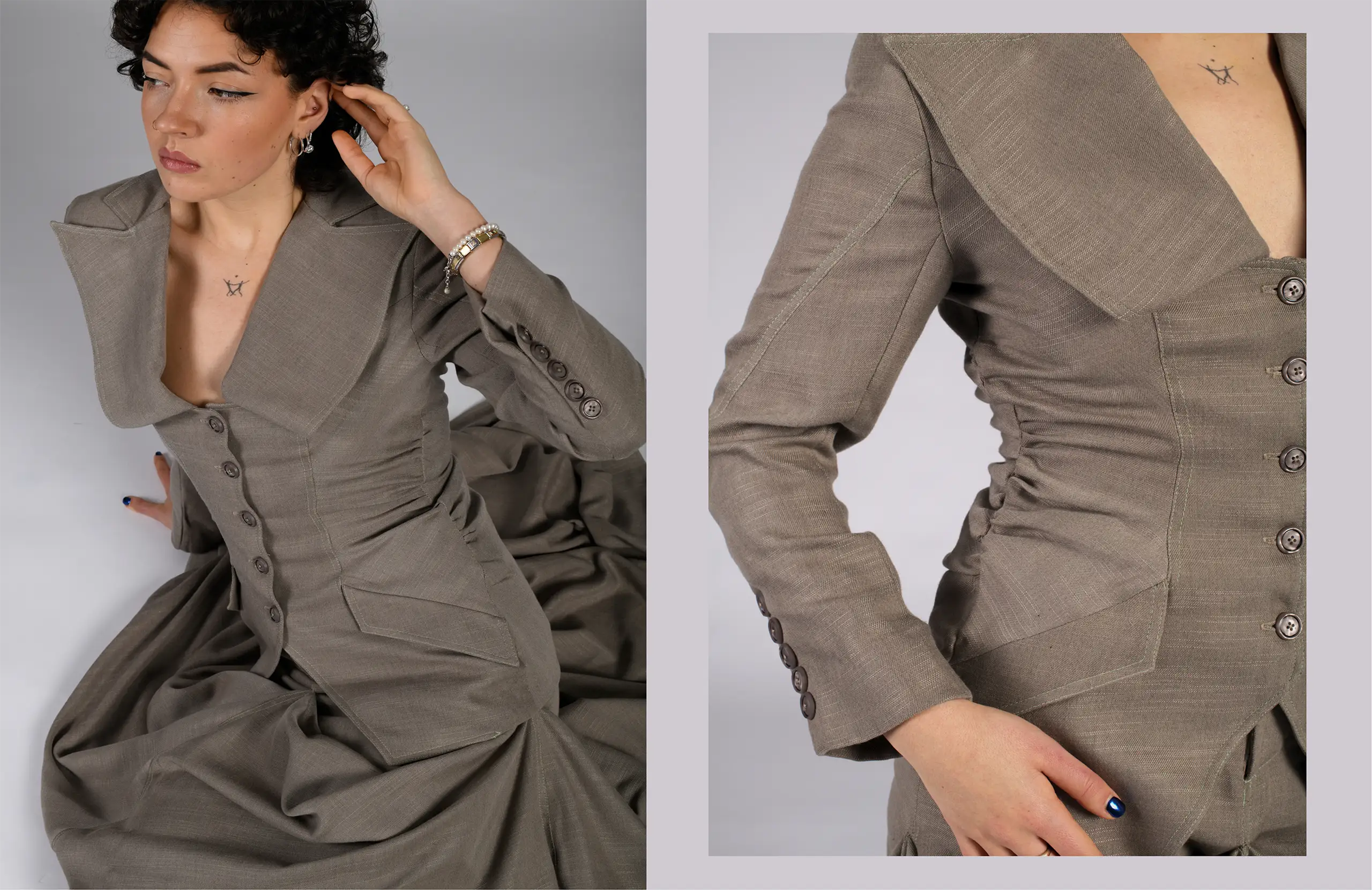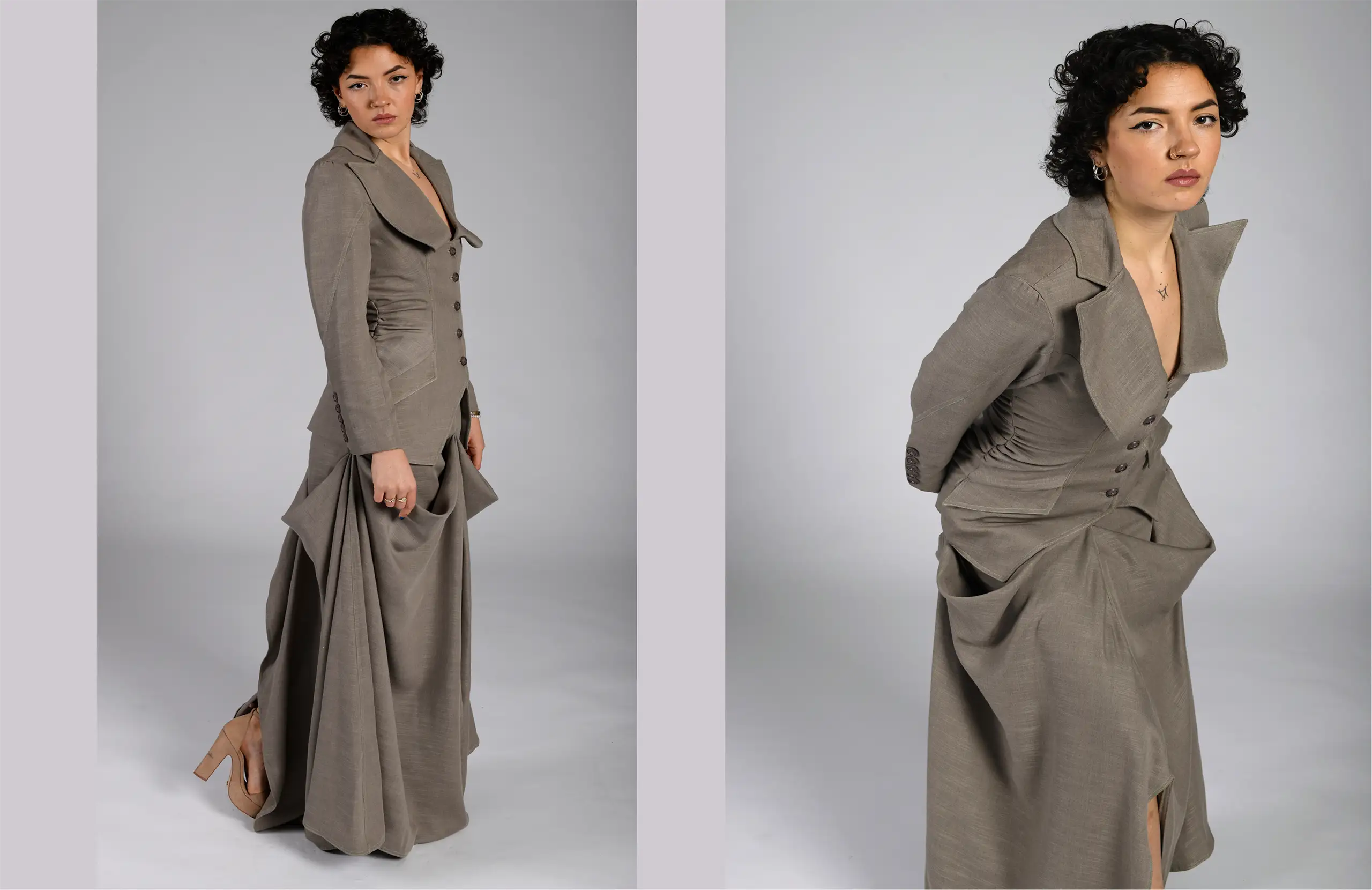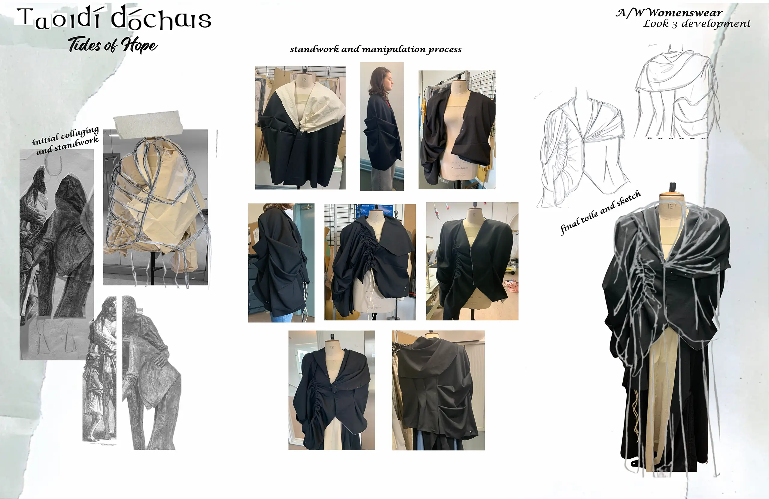Inspired by the rich history of Irish emigration to America, my A/W womenswear collection reflects the emotionally and physically challenging journey of Irish immigration, which began with the Great Famine of 1845. With particular reference to New York, a city shaped by its Irish diaspora, my collection explores duality of identity, the pain of displacement, and the hope of a new beginning. Through my use of innovative techniques such as laser cutting and engraving, I created a visual narrative, with laser cut lace and written script, which alongside both fluid and chaotic drapery and tailoring, and asymmetric silhouettes, allowed me to convey the tension, fragmentation and fragility of the immigrant experience. My chosen colour palette captures the emotional weight of this narrative, drawing inspiration from national famine memorials in the west of Ireland, The shades of blue and green with rust orange, echo the Irish landscape while symbolizing sorrow, heritage and hope. The fabrics I used in this collection, mainly wool blend suiting, reflect Ireland’s rich heritage of working with wool fibres. This fabric allowed me to create my desired flow and drape, whilst also supporting my complimentary tailoring. Within my fabrics and colour story, I incorporated plaid and pinstripe patterns, drawing from both Irish heritage and the culture of New York. These elements contribute to the visual disarray, reflecting the complex identity of an immigrant. In all this collection is a reflection of our heritage and a homage to the resilience, complexity, and enduring spirit of the Irish immigrant journey.