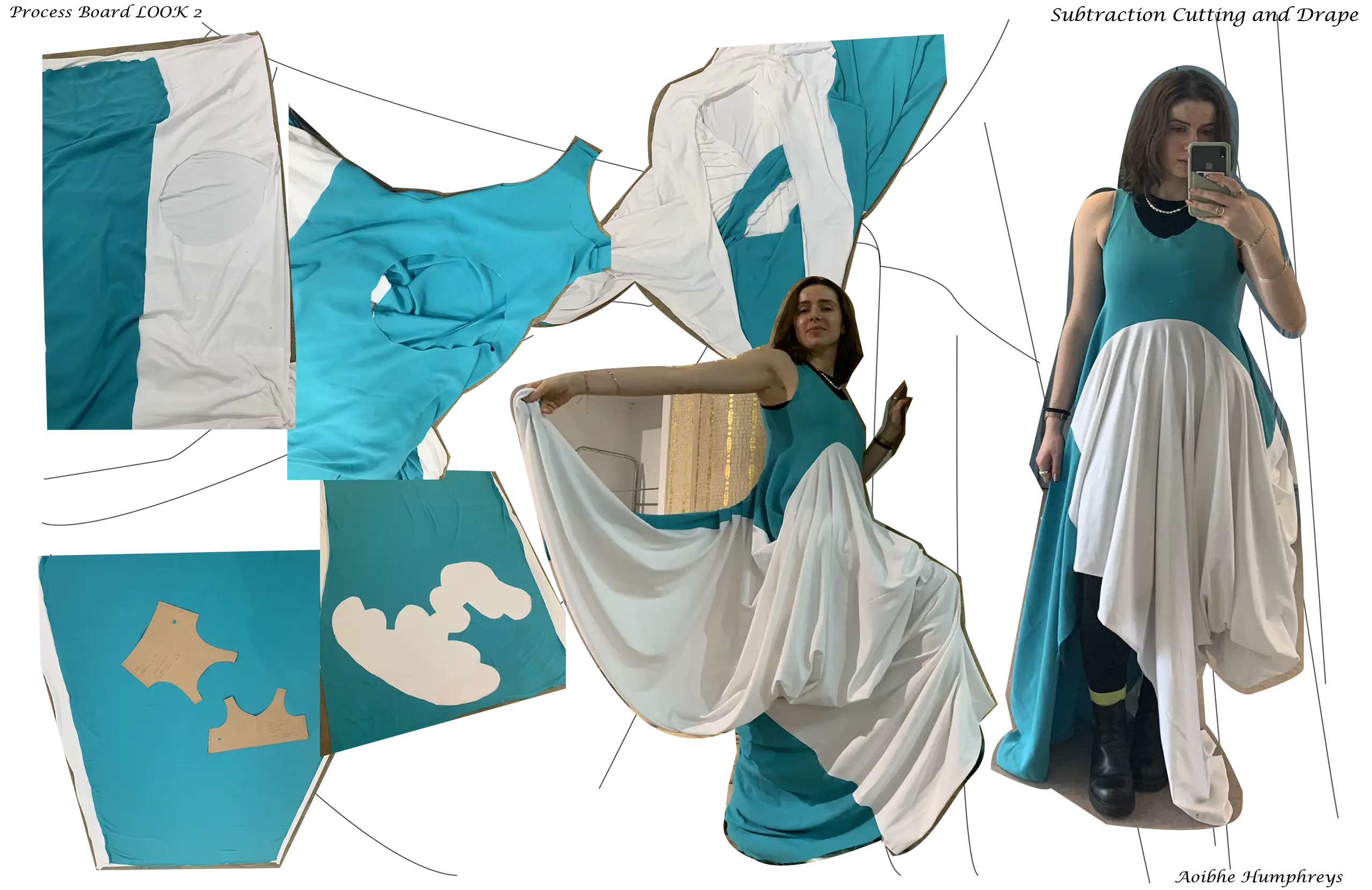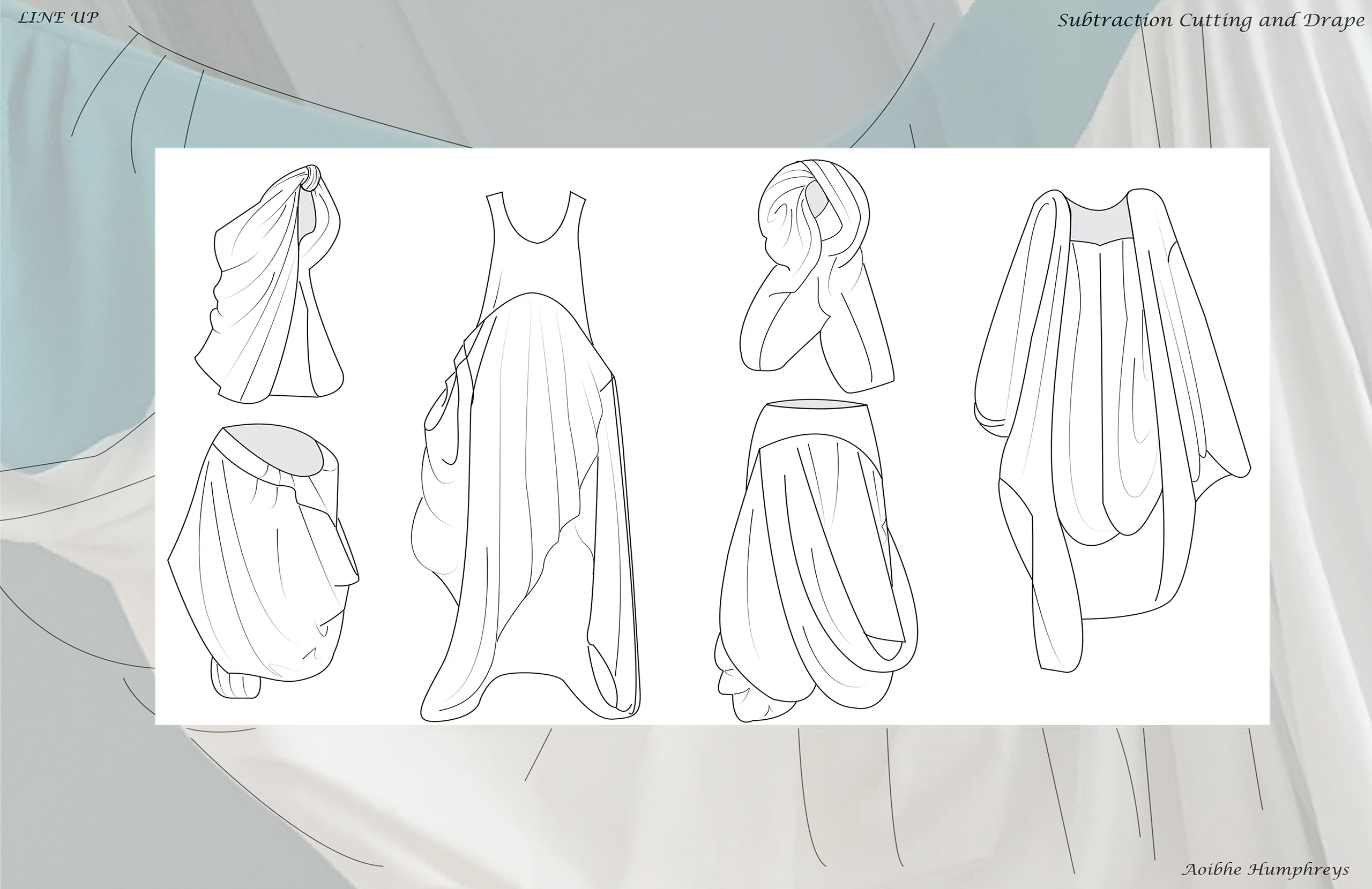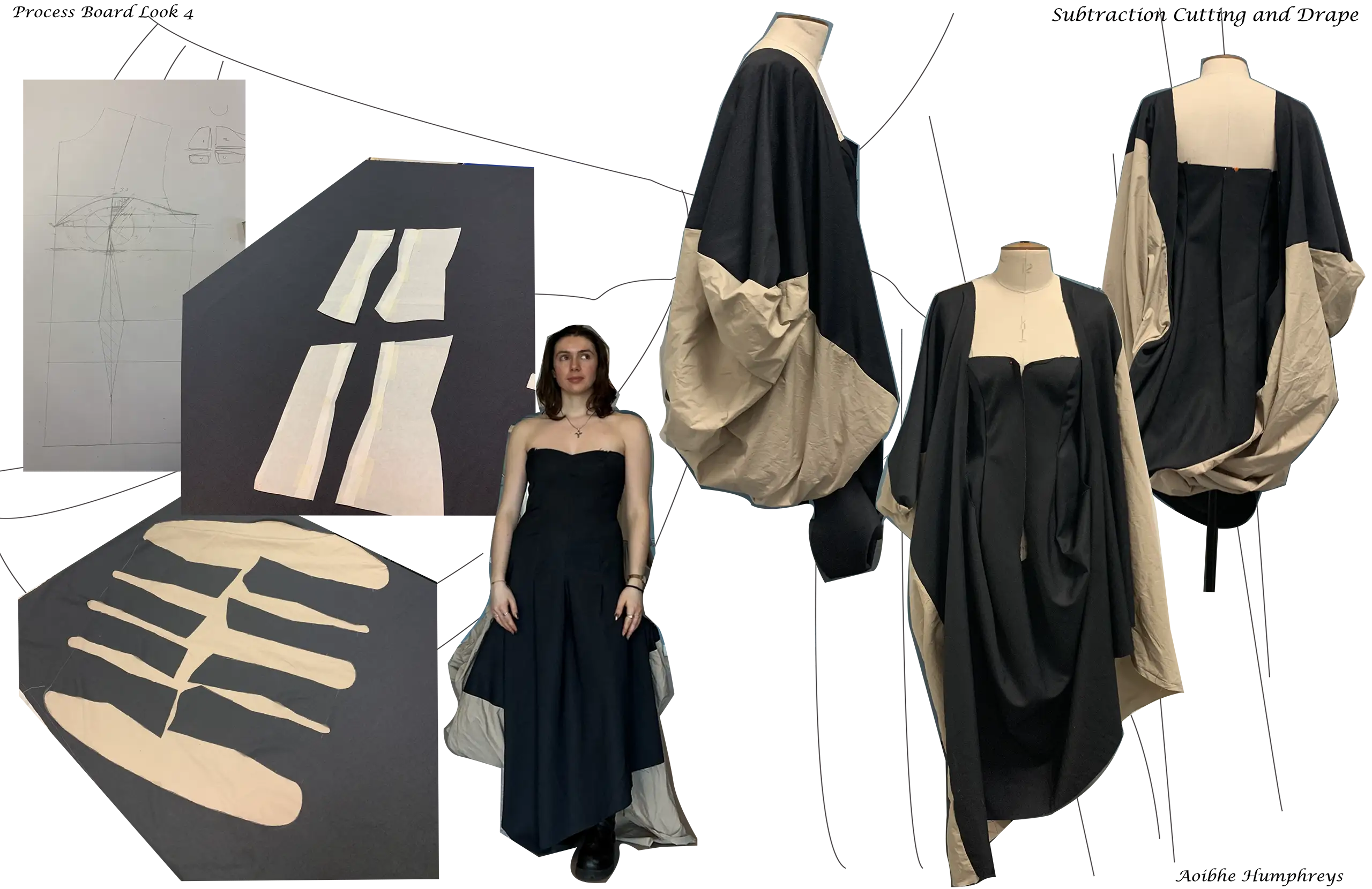 This Project was based off a workshop in subtraction cutting with Julian Roberts. Subtraction cutting is an experimental pattern cutting technique developed by Julian Roberts, with focuses on strategically and experimentally removing (subtracting) the fabric from the one larger piece, as opposed to traditional pattern cutting which relies on the precise merging and creation of patterns. This practice in turn creates voluminous and extravagant drape and silhouettes. From this initial workshop, I practiced and experimented with the technique further and incorporated stand work from smaller samples to build a mini collection of abstract pieces.
