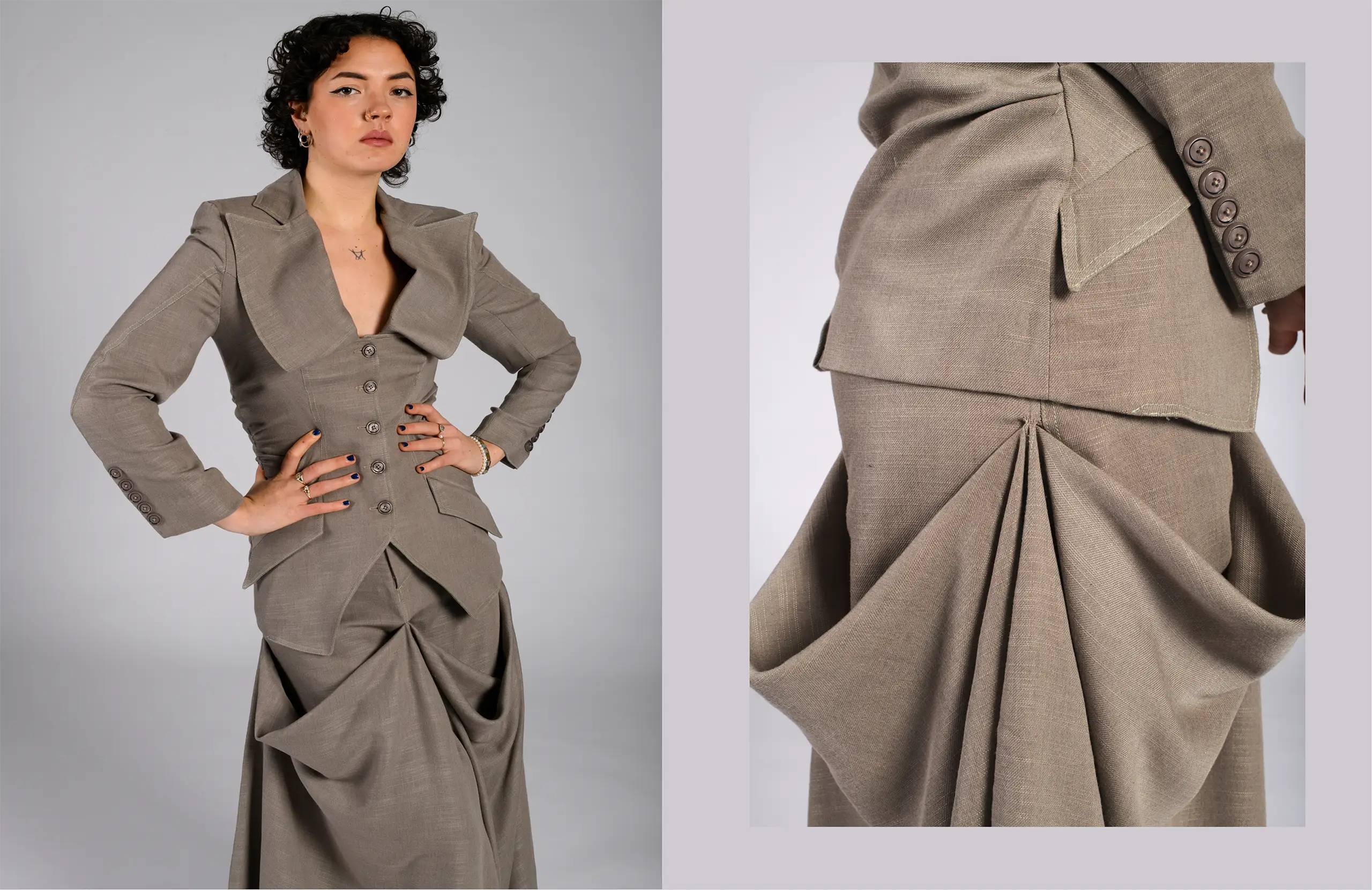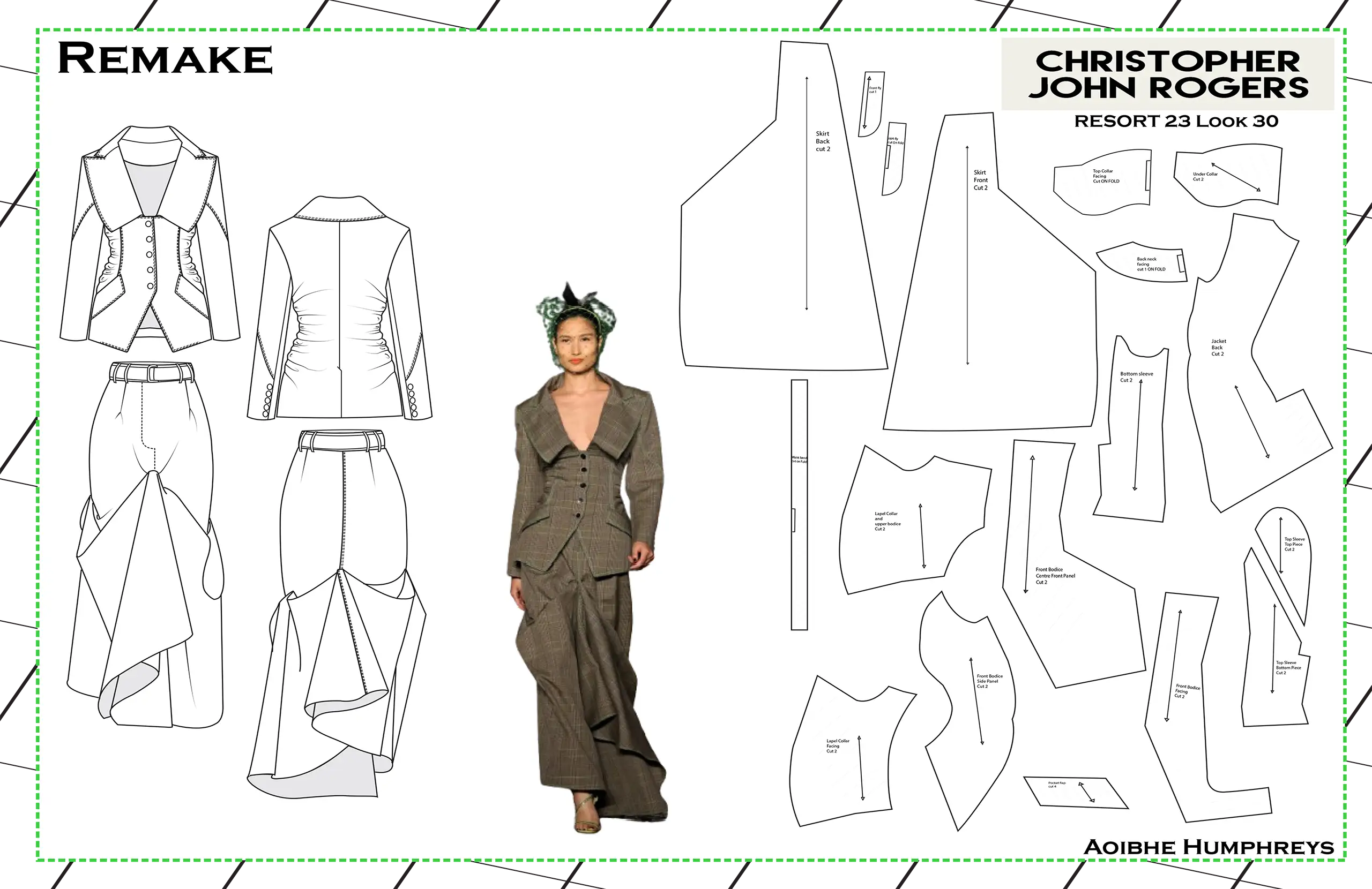 The Remake Project is a Technical Pattern drafting project, which involves recreating a piece by a chosen designer. the objective of this project is to enhance technical and pattern drafting skills and to practice the ability to interpret, make and create what you see. My chosen piece to recreate was look 30 from Christopher John Rogers Resort 2023 collection. I chose this piece for it’s mix of technical tailoring in the jacket and drapery in the skirt. There was a lot of learning in this project in deciphering how the pieces are made, which process is best and how to approach the execution.