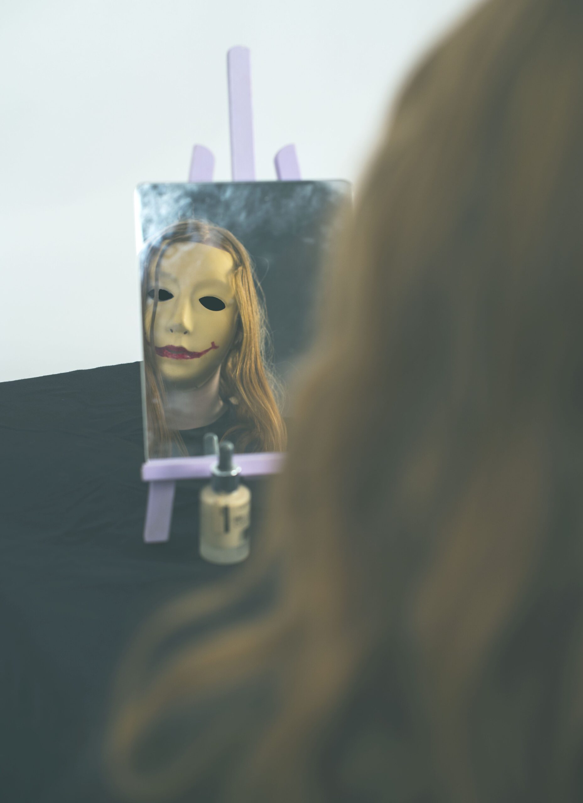 Depression causes people to wear emotional masks in order to cope with their daily life. Artist Aoife Shine uses this shroud as a prop to convey the hardship of recovery and repair. This mask opens up the idea of introspection. She uses herself as a medium for her practise to honestly explore her inner minds workings and uses her body to express the mental condition. Art for her is a relief from her struggles and she uses its creative properties to impower and create states of being. Her artwork is made in solidarity for those who suffer from similar experiences and comments on the assumptions people have on the symptoms of mental health. Aoife’s visuals stem from emotions of confusion and states of overwhelming abandonment. “I am not Okay” is an exploration of Aoife’s consciousness through personal motifs and self-reflection, critiquing on past decisions and the fear of future repetition.