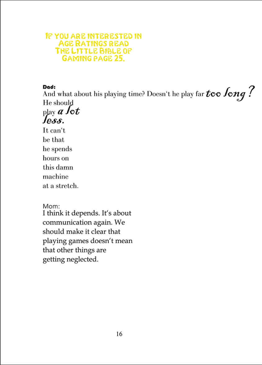 “The Little Bible of Gaming” deals with the conflicting perspectives of parents and children in relation to video games. Misunderstandings based on ignorance often not only hinder access to games, but also strain the relationship between parents and children.