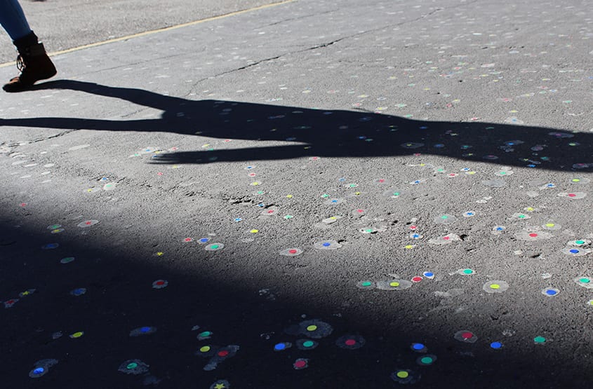 These creative interventions hold a dialogical process; they strive to engage the public with their surroundings through the simple act of looking. The interaction with the public while installing the work triggers this visual dialogue. I track this development throughout the interventions life- span in its specific location.