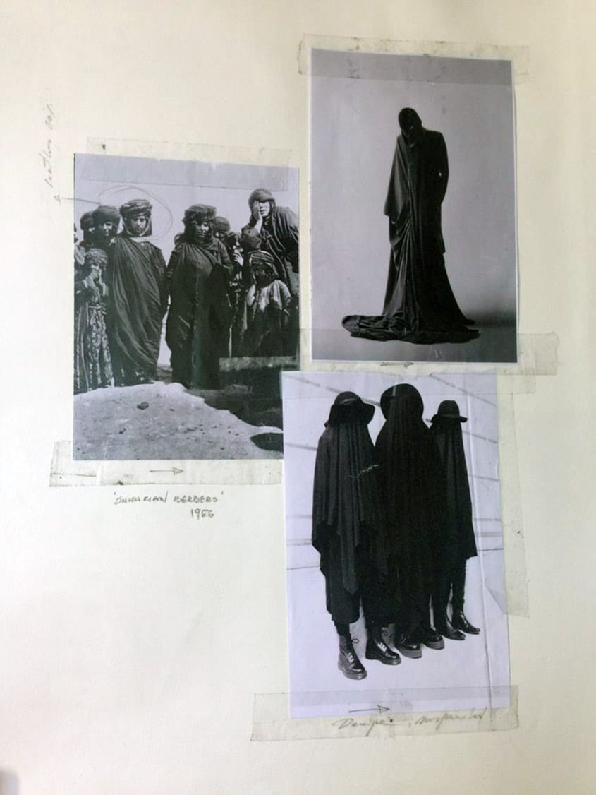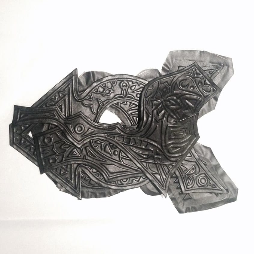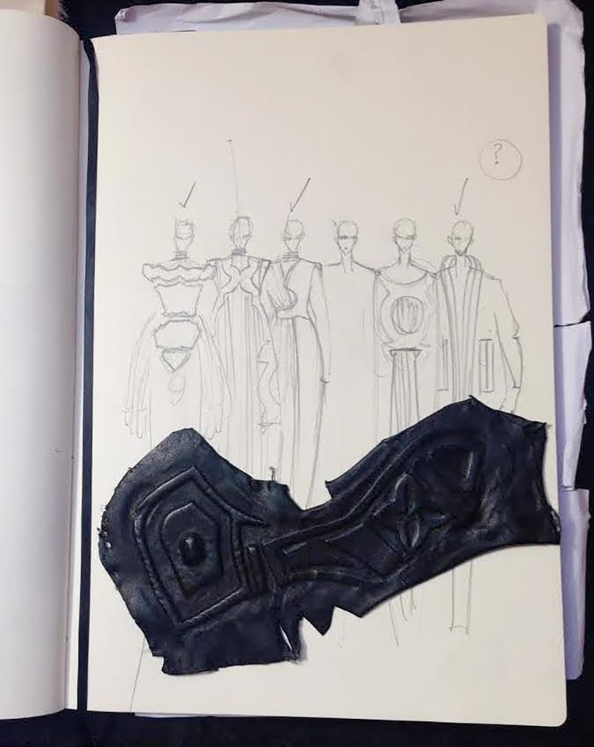 Different symbols such as magic squares, eight pointed stars, other geometric figures which are used in order to deal with darker forces and curing illnesses inspired me to create hand-made embossed leather textures which are the key element of my collection. Long silhouettes and tailoring represent modesty and strength of Berber Warrior.