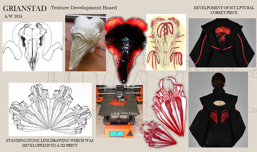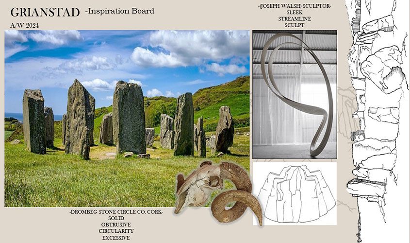 The garments created within this collection are fitted with sculptural silhouettes. These pieces are adorned with textural designs such as a built-up sculpture inspired by a ram’s skull, or line drawings which were reactionary to Drombeg Stone Circle in Glandore, Co. Cork which then were digitised, and 3D printed.