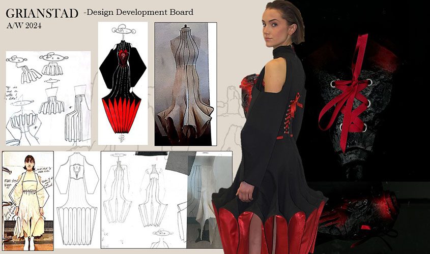 ‘The Otherworld’ in Irish folklore is where deities and fairies (An t-Aos Sí) dwell, making it is a key component within Irish Mythology. It is said that the colour red represents An t-Aos Sí in these folktales and that is why red is one of the two main colours within the collection. Taking inspiration from these ancient rituals and ritual sites has led to a collection which is a personal interpretation of contemporary Celticism.