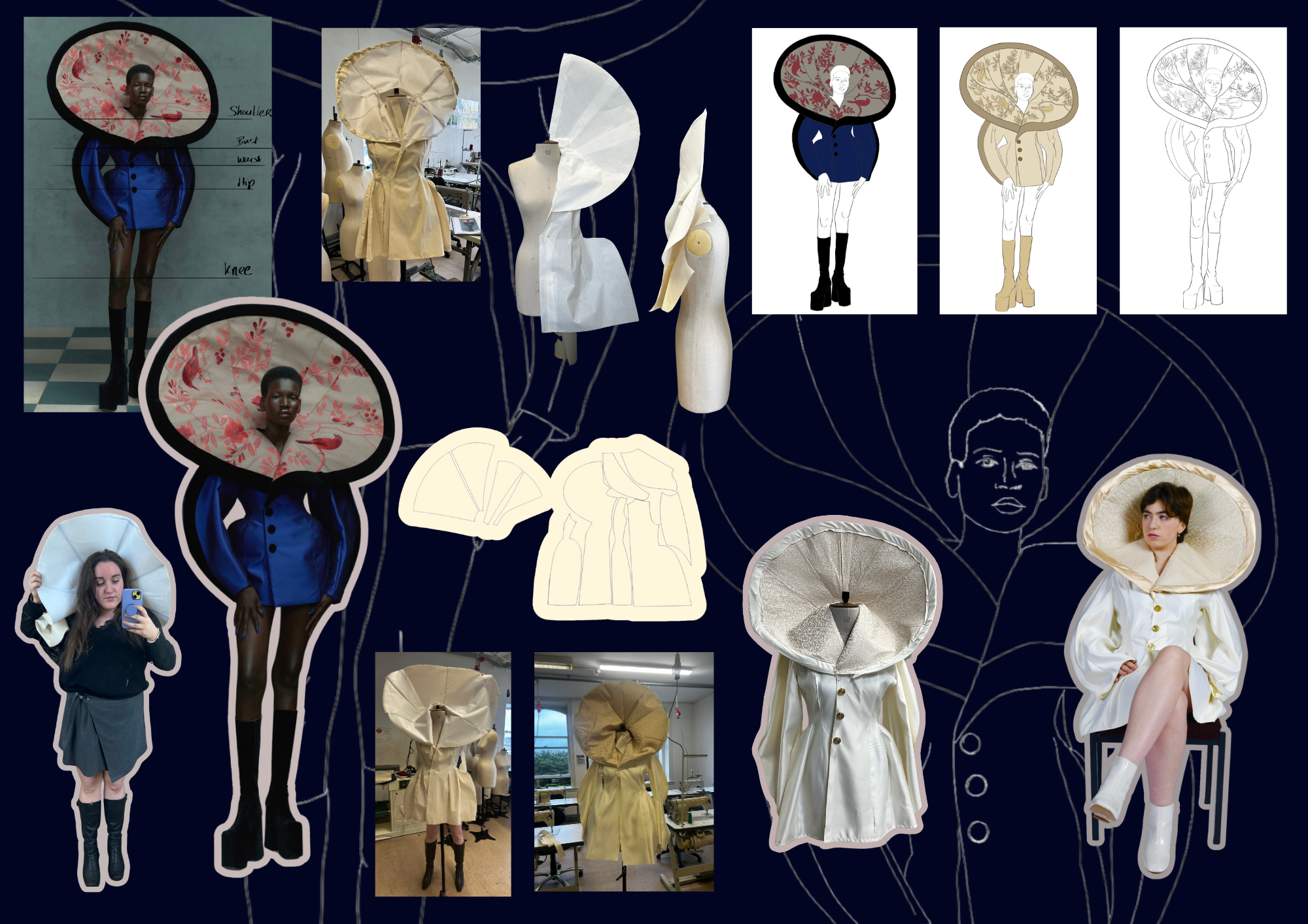 Through digital design in Adobe Illustrator, I developed detailed flat drawings that merge functional silhouettes with symbolic elements drawn from early 2000s culture, school life, and rural/urban contrasts. The collection embraces soft tailoring, oversized fits, and layered textures to reflect the fluid and evolving nature of childhood identity.