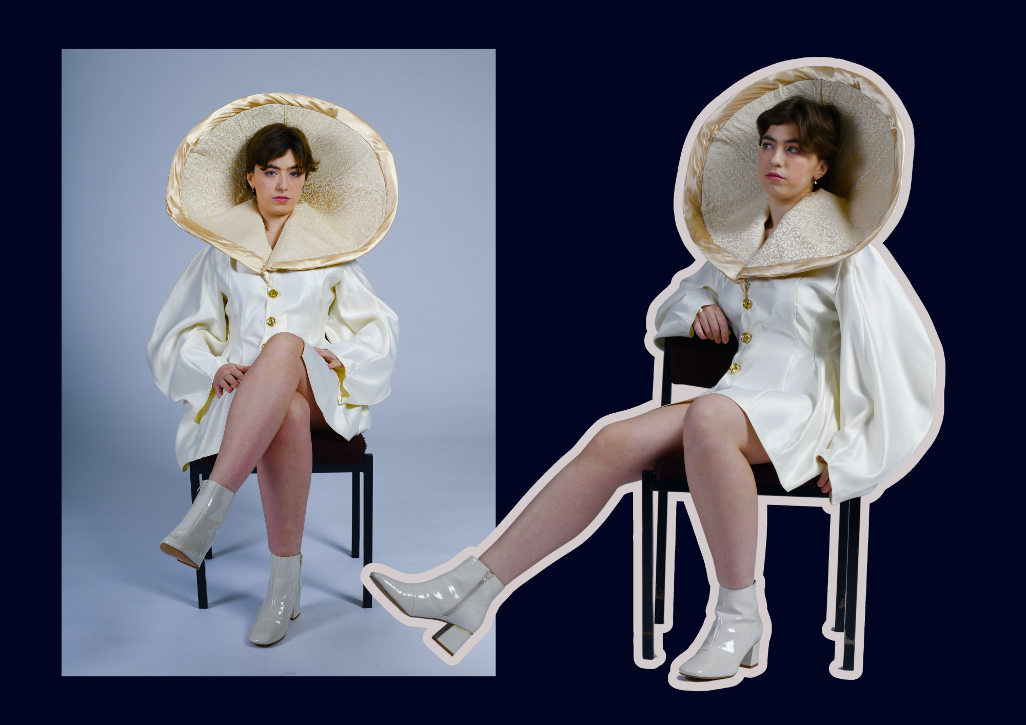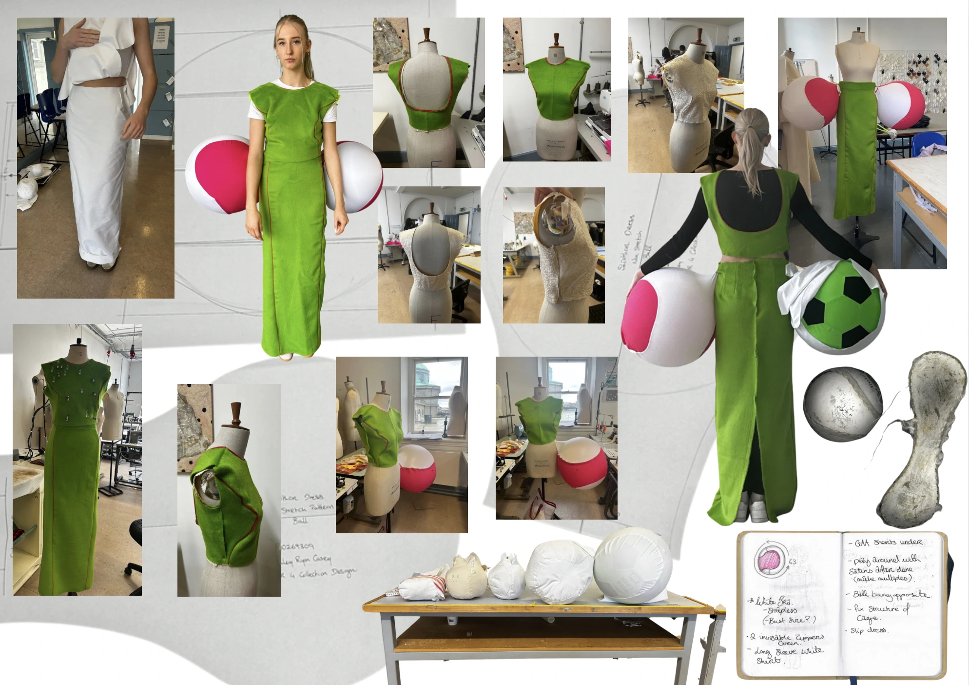While rooted in nostalgia, this collection is far from traditional. I’ve infused classic silhouettes long dresses, GAA jerseys, and shorts with unconventional forms and bold material choices. Sliotar-inspired curves and scaled-up Guinness graphics meet rich Dutchess satin, crisp cotton, raw leather, and high-shine PVC.