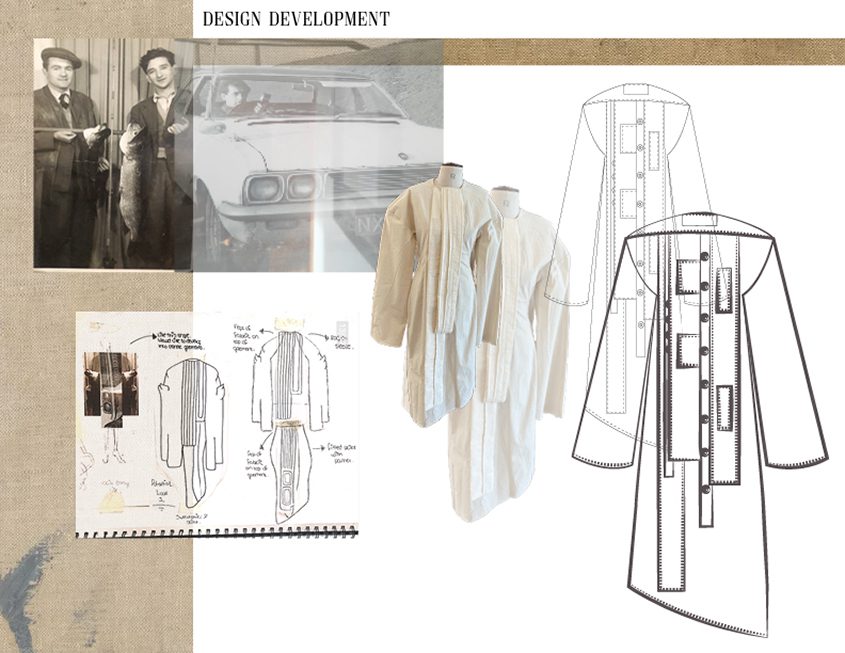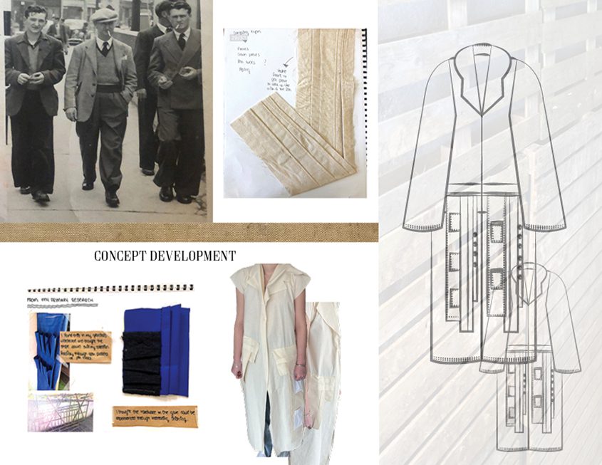 My Final Collection is based on the amazing life and home of my Grandad, John Linnane, in Castledaly, Count Galway – ‘Castleboy’, Teach na Gaillimhe. I took inspiration from the traditional fittings and infrastructure in his home, dating back to the 1940’s. I was also influenced by old photos of my. Grandad and his life around this time. Using shapes and fittings from old portraits of his car, shed and tool belts, I found a continuous form for my collection. My inspiration for colour came from the dated, tarnished, rusted tools that he had left in his work shed. The use of continuous linear layers in my designs were deeply inspired by his lifelong love of working and manufacturing with his hands. I repurposed hardware and tackle elements that I found in his tool box, throughout the collection. This element of my designs is similar to how he would have worked – continuously reinventing and repurposing.