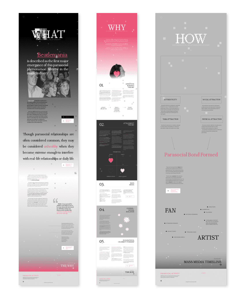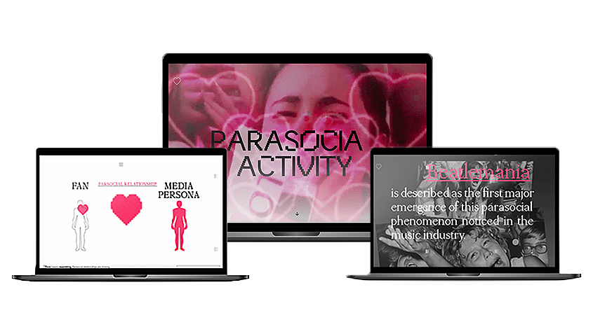 Parasocial Activity is a website created to inform and spread awareness about the modern-day phenomenon of parasocial relationships; an unrequited, imaginary relationship between a media user and a media personality. The platform breaks down the complex psychology behind this phenomenon – in a what-why-where-how structure to be easily understood by the viewer. The video on the landing page introduces the user to the topic, giving cultural context through visuals of screaming fans at concerts and fans engaging in parasocial interaction online.