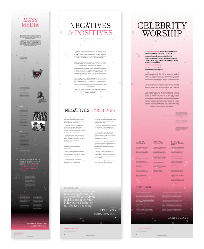 The concept behind the bitmap-style and floating pixels throughout the website reflects the online nature of these relationships in today’s society. The serif typeface is informed by the psychology-related research used to examine the content, as many studies and articles use a refined serif typeface in line with academic standards. To compliment this informative tone, a black, white and grey colour palette is used with pops of pink, commonly associated with love and relationships. The website is also accompanied by short animations as a visual aid throughout, explaining the different subject areas. The mission of the website is to educate, raise awareness and nudge towards a shift in the future of fan culture in the mass media industry.