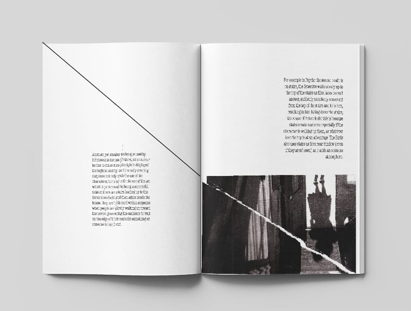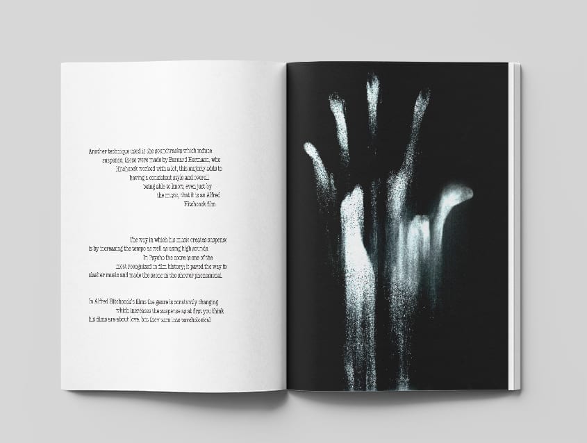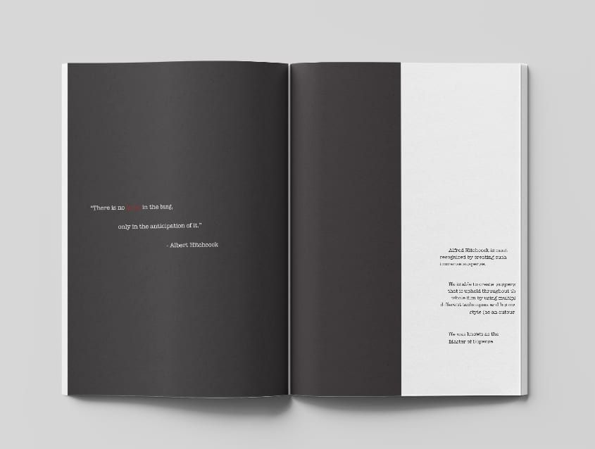 Using a combination of type; layout, images to create a script like book that has a Hitchcockian vibe. There is very little colour used on the script choosing a script because of the importance the script was to Hitchcock. As well as the size which is based on American sized A4 page which is different. They layout and images have elements of suspense used. In the way they are laid out. Nods to motifs and objects he used in his films.