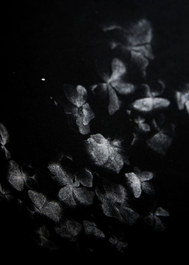 The importance of the echo of grief in everyday life has become an integral part of O’Sullivan’s practice in the last few years. The fleeting nature of grief in and out of one’s day, the confusion of what feels like never-ending despair, a failure to escape the death of a loved one. She uses the flower as both a personal and universal symbol of mortality, inspired by the changes a flower goes through once it is plucked from its life source. This notion has become an important way of depicting the unpredictable journey through grief. The flower also has important roots in the culture of death universally which lends itself greatly to O’Sullivan’s work. In particular, The Victorian Culture of death – from mourning wreaths to the colour black. Through the technique of mezzotint, it is her hope that the dark, velvety, ephemeral image evokes a sense of loneliness, confusion, sadness, beauty, peace and everything in which her own journey through grief has awakened.