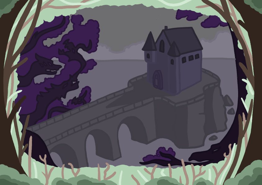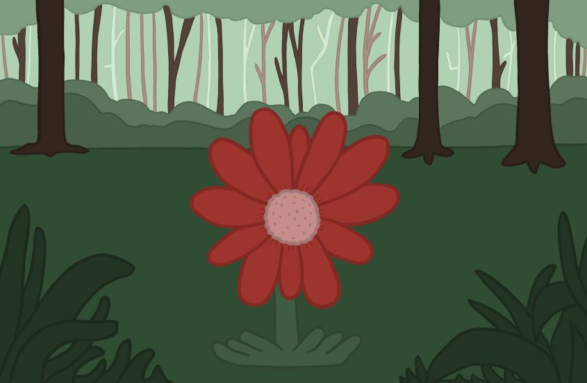 The colour palettes in the animation vary between bright greens and deeper purples to signify an environmental and mental change as the protagonist continues on her journey for answers.