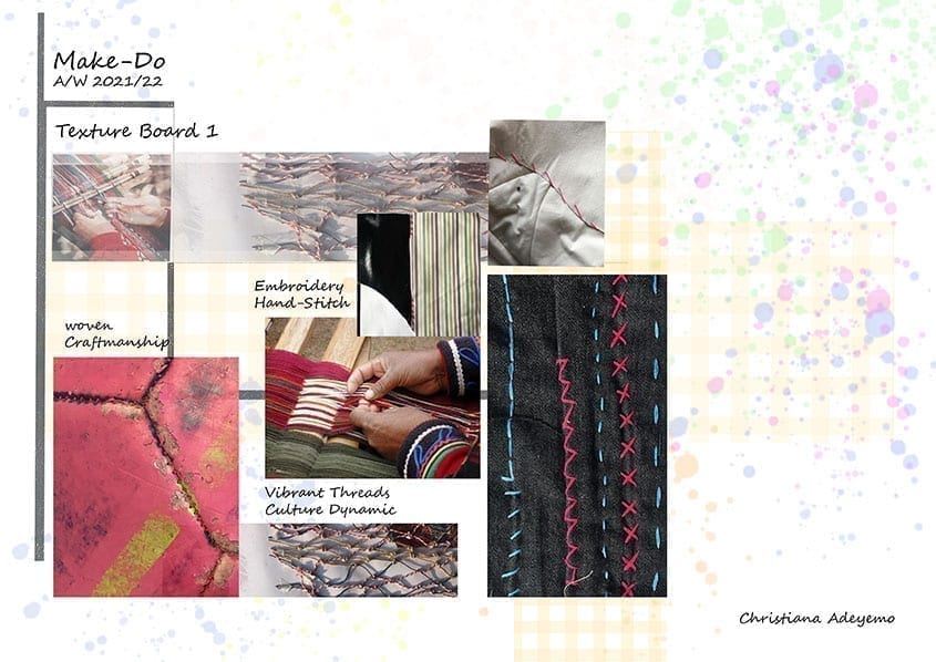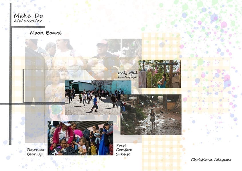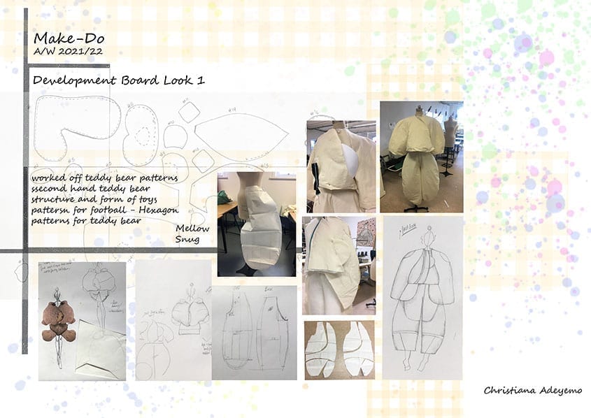 Based in the Northern Triangle of Central America, the countries of Guatemala, Honduras, and El Salvador, my inspiration is drawn from the adaptation of children to their environment in the poverty-stricken shantytowns. The children in these shanty towns adapt to their environment and unlike those from richer neighborhoods, these children do not have access to fancy toys, and so they make-do with basic toys, such as second-hand teddy bears, footballs and homemade skipping ropes. The foundation for this collection is to showcase the toys these kids find joy in despite their misfortune. I responded using my own drawings of the make-do toys the children played with. I researched and designed from found teddy bears and footballs to inspire my collection. I let this concept inspire my collage and shape development. In my work, I translated images of the kids in this environment to inspire techniques such as exposure of raw edges and hand-stitched ripped seams. This project also looks back into south America culture and their use of craftmanship which inspired me to develop my craft by applying hand stitching and embroidery work in certain areas. Using materials such as boucle, fleece, denim, pvc, cotton print, lame, and wadding to contrast between soft and structured fabrics.