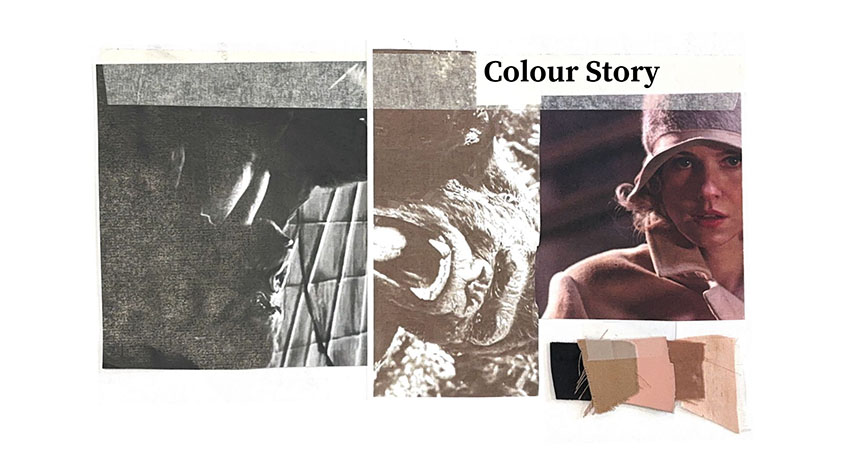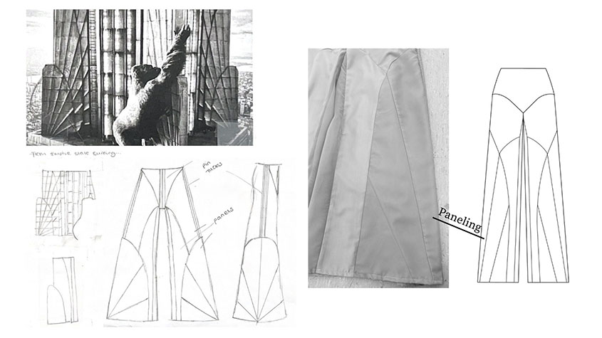Shape inspiration comes from the gorilla and the paneled glass of the Empire State building. I was also inspired by the glamour of the 1930s evening wear in Hollywood. Satin and silk. I explored complex seaming and paneling as derived from architectural details of the empire state building. For colour I drew inspiration from the sepia tones of the 1933 original film infused with feminine peaches and pinks of the main female lead.