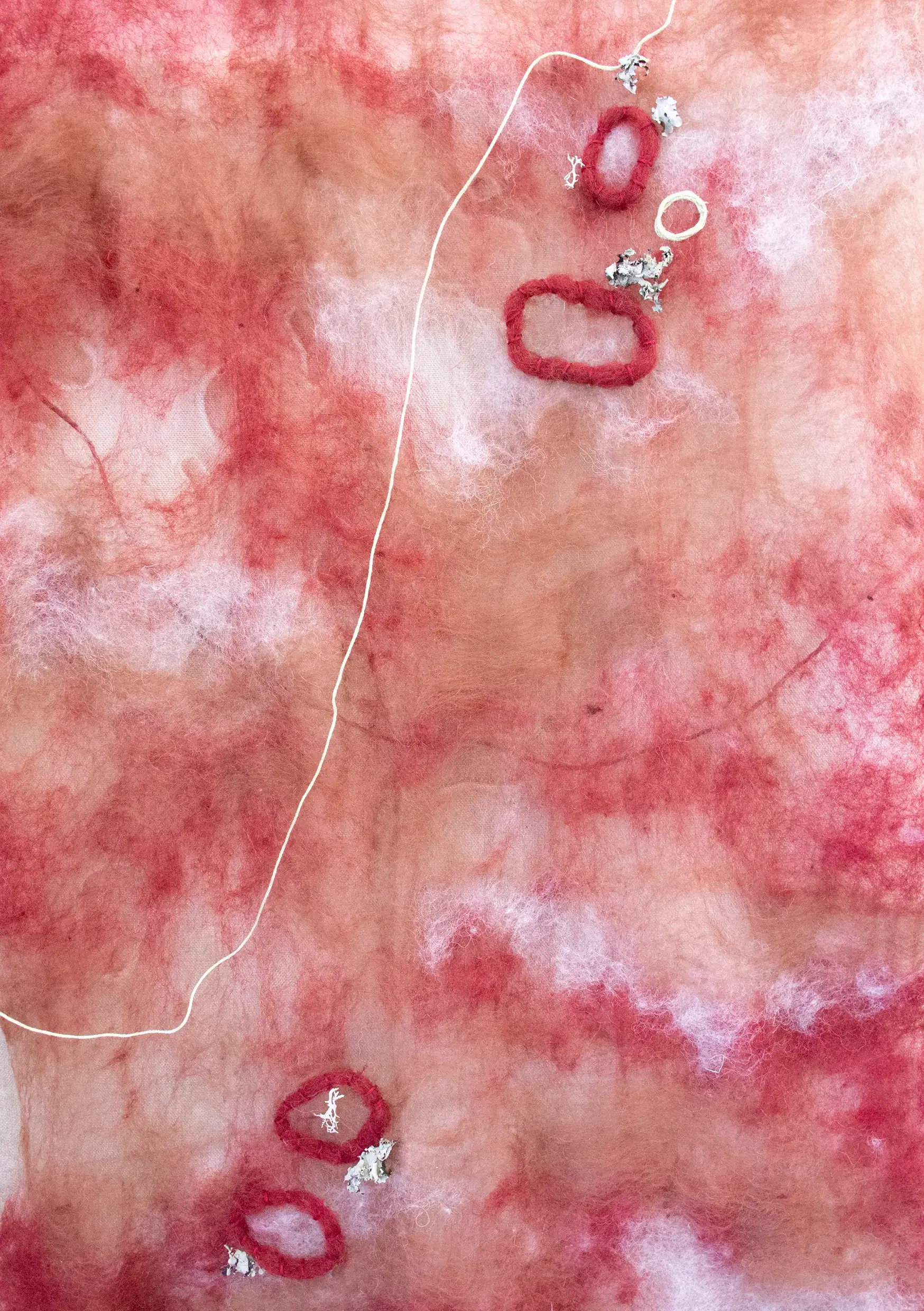 A key point of interest in Ciara’s work is the delicacy of the natural world. During a time when the effects of climate change can be seen so clearly, Ciara uses embroidery and light-weight materials to capture the fragility of nature. She uses wet felting techniques to create thin, translucent materials which are suspended in the studio space. These delicate cylinder structures resemble the intricate processes that govern the growth and regeneration of nature. Each piece is produced, with its own web of structure and individuality. It is easy to forget the complex growth process of each tree, plant and fungus in our world. This work calls for the viewer to pause for a moment and examine these structures.