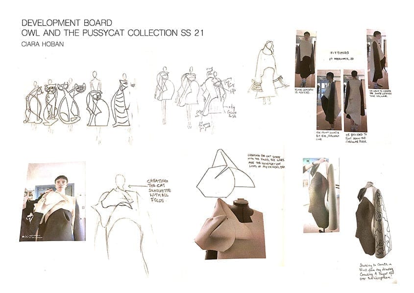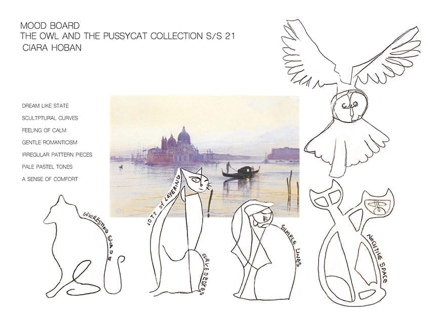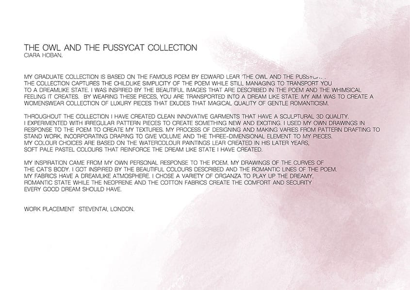Throughout the collection, I have created clean innovative garments that have a sculptural 3D quality. I experimented with irregular pattern pieces to create something new and exciting. I used my own drawings in response to the poem to create my textures. My process of designing and making varies from pattern drafting to stand work, incorporating draping to give volume and the three-dimensional element to my pieces. My colour choices are based on the watercolour paintings Lear created in his later years, soft pale pastel colours that reinforce the dream-like state I have created.