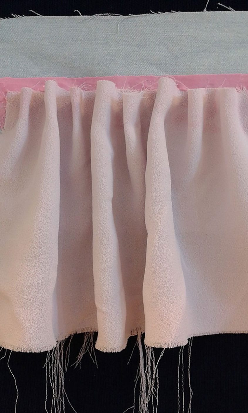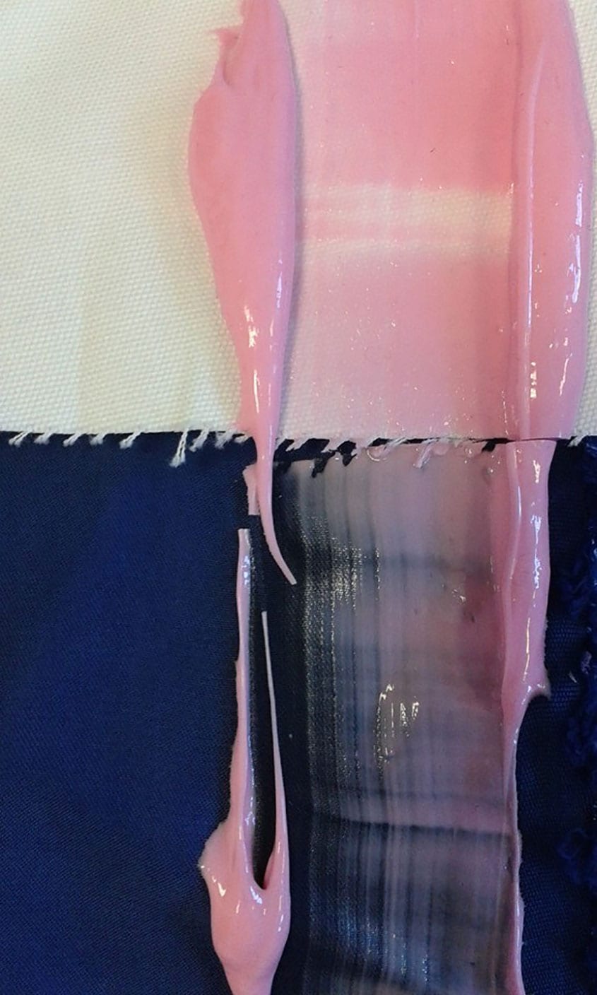 Using liquid silicone to interact with my base fabrics, I also focused on acts of spilling and pouring, allowing the materials to react naturally, and set, creating their own sense of static motion.