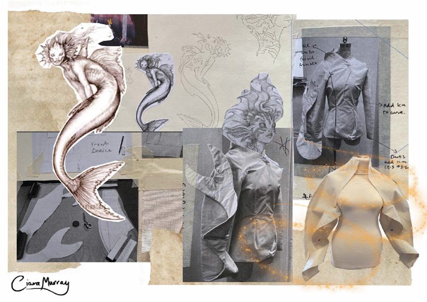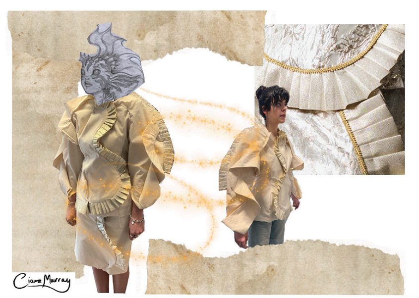 My collection is inspired by J.M Barrie’s novel ‘ Peter pan’, particularly the mystical island that peter pan in habits. I am fascinated by the idea of Neverland and the inhabitants that live there. The fantasy land where time ceases to exist and fairies and pixie dust can you make you fly is a delightful concept which I would like to bring to life in my collection. Through luminous and ethereal fabrics and textures I aimed to replicate the pixie dust and fairy magic that the island of Neverland is built on. I aim to explore the idea of make believe and magic. Fantastical and otherworldly creatures found on the map of neverland inspired the shape of the garments. Using technical processes in the construction process of the garment such as pleating and applying rounded and swirling cuts to the garments mirror the encapsulations of the island.
