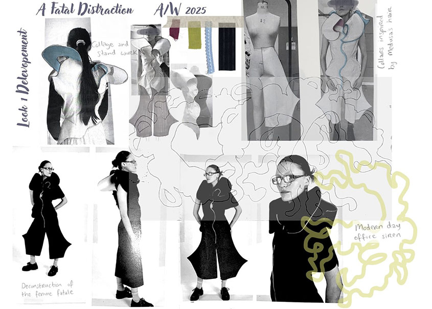 In Greek mythology, the femme fatale archetype was said to harbour a deep hatred towards mortal men, luring them to their death with the distracting and dangerous female charm. Drawing shape inspiration from masterpieces by Caravaggio and Bernini, I used collage to intertwine Medusa’s serpent motifs with the elegance of tailored silhouettes and flattering waistlines reminiscent of the 1940’s era. Classic Film Noir captured the demonisation and male anxiety surrounding the femme fatale’s evolving societal status. Embracing her duality, I blend pinstripe wool suiting with revealing cut-outs and bright coloured evening wear fabrics. My design process included pattern drafting and stand work, followed by the reintroduction of my organic collage outlines through piping and trimmings.
