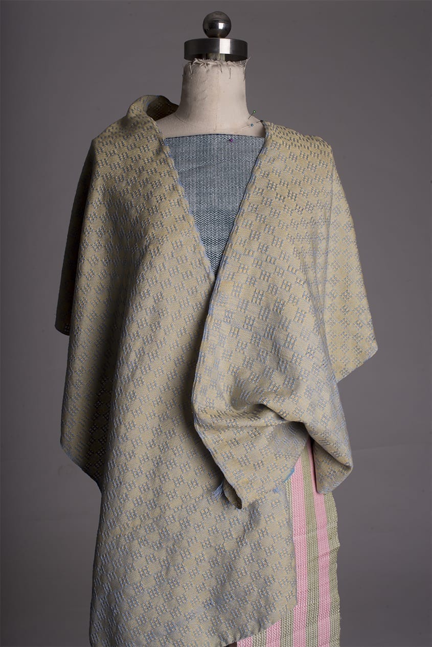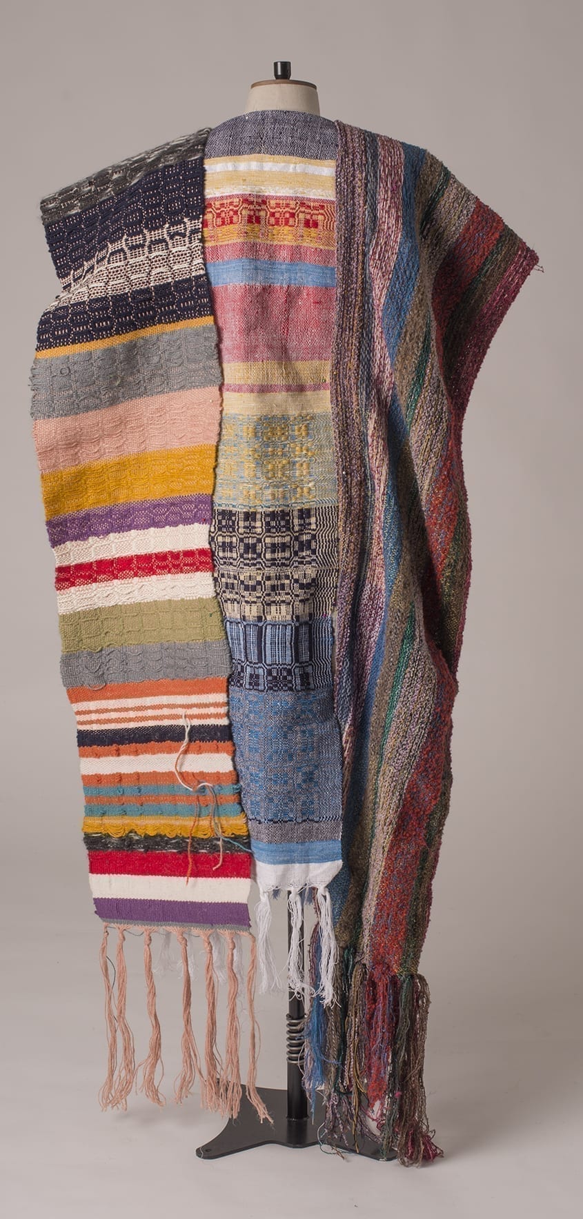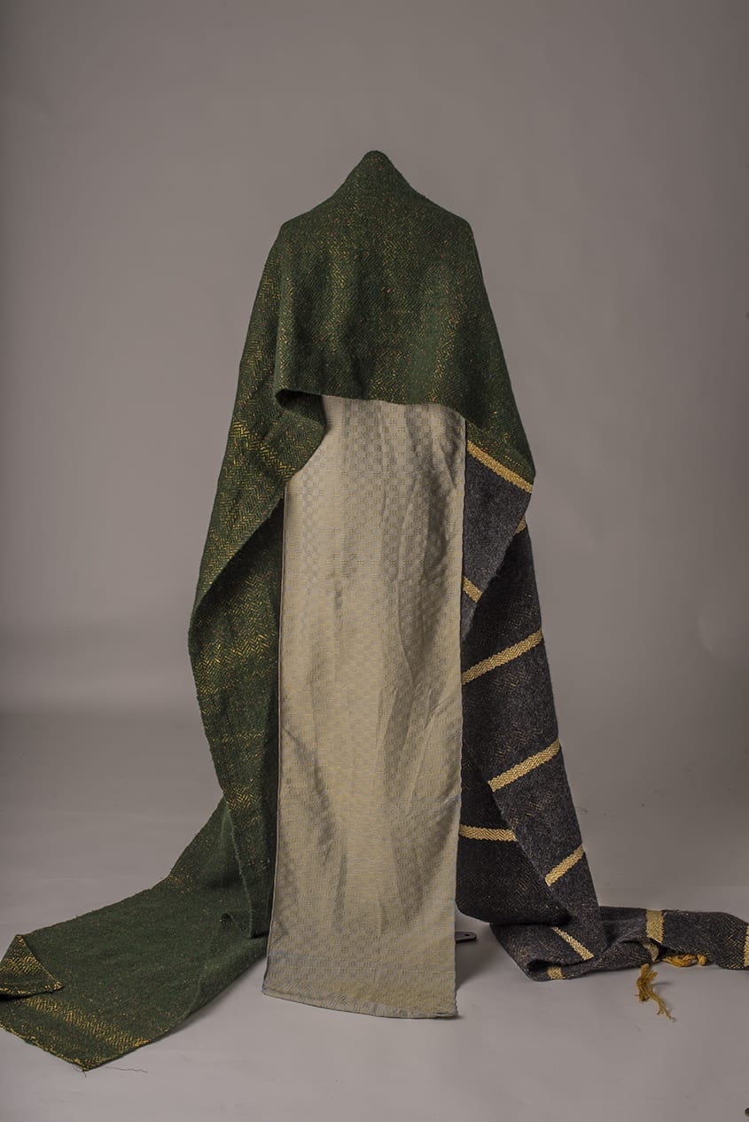 In 3rd year I started weaving on a 4-shaft loom. During the summer of 2019 I visited Claire Island to take part in weaving workshops with professional weaver Beth Moran. Upon returning to college for 4th year, I wanted to weave fabrics suitable for making kimonos. The name Shioda comes from my Grandmother, Elizabeth Shioda, who was born in Wales but whose parents were from Japan. Growing up I was told Shioda translated to seashore. My collection is a series of textiles, woven and knitted, inspired by colours and patterns that I found while taking photos of the Sunny South east coastline. I experimented using silk yarn and hemp yarn because my research found that kimonos are produced using these yarns. Many of the textiles were produced to be 40cm wide, which is standard kimono fabric width.