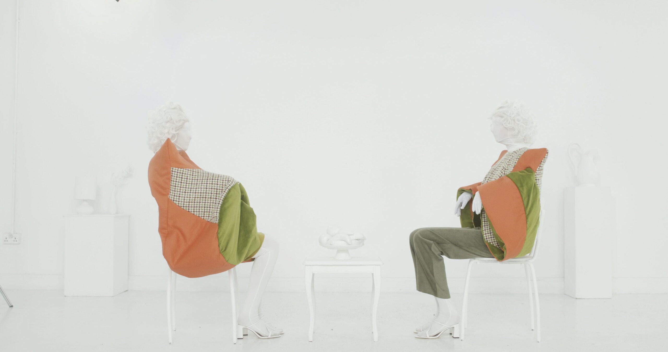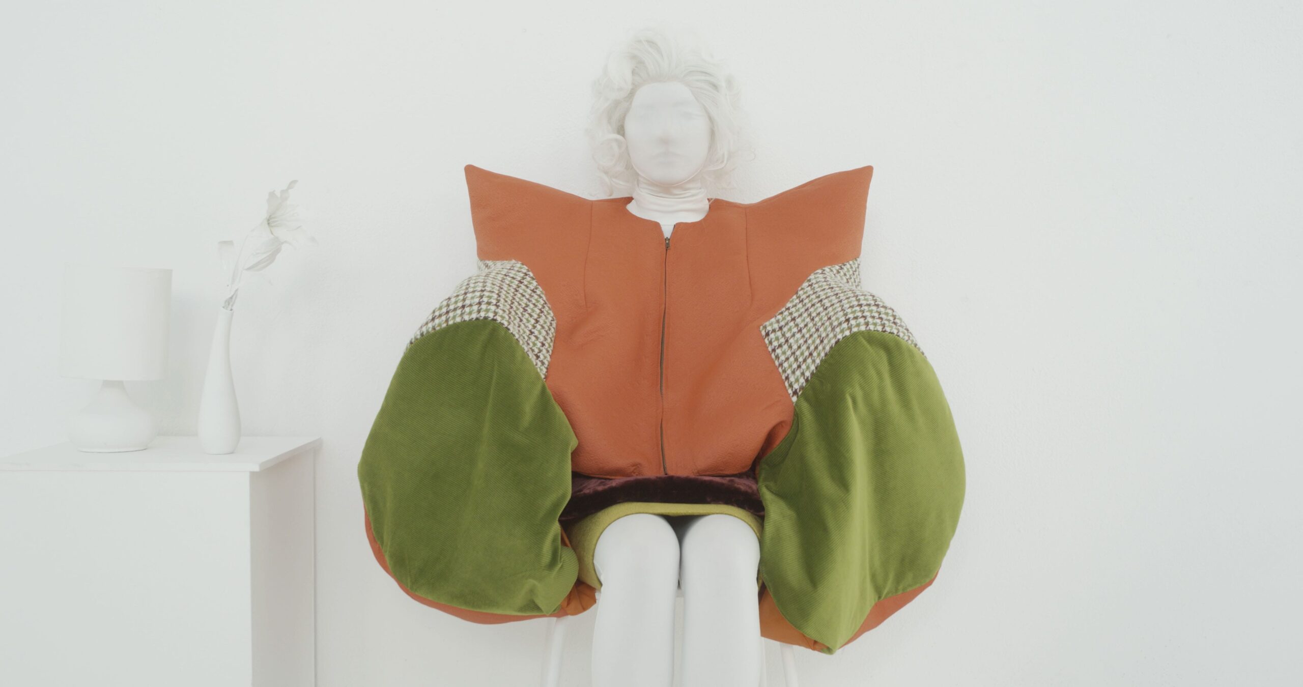 S.W.A.L.K (Sealed with a loving kiss) is inspired by my parent’s relationship in 1979 & the letters they would send. Each one sealed with S.W.A.L.K. Looking at my father’s background in the military and mother’s time spent working in a 70’s hotel. Researching their story as a designer I wanted to emphasise the hotel furniture in my collection versus my father’s military Uniform. I achieved this by developing furniture patterns & working on the stand. The linings of some of my pieces have handwritten words from my Father’s love letters sent back and forth between them. Using a mix of wools, velvets, corduroy & interior fabrics brings through a nostalgic 70’s & contemporary tailoring feel.