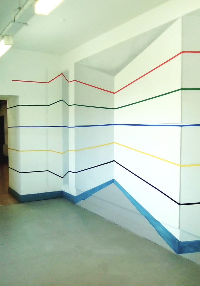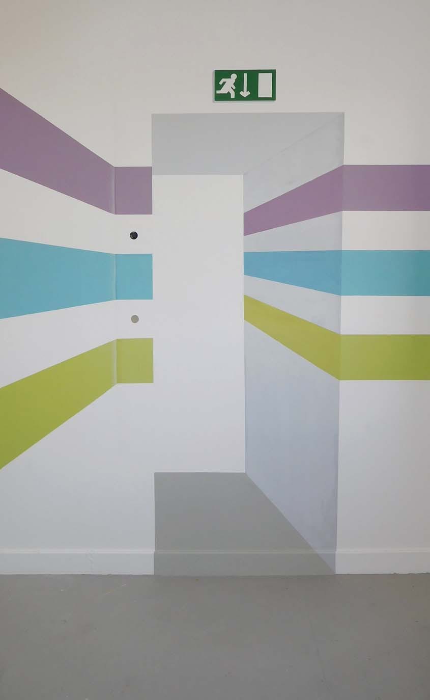 The site specific painting installations adopt architectural spaces we occupy. Perspectives both spatially and conceptually are dissected and reassembled, manipulating and altering these spaces. The results present an interactive visual expression of the complexities, tensions and contradictions which often play out in our understanding of our contemporary existence. The intention is to heighten critical thinking through focusing on the capabilities of our internal information processing, encouraging the audience to question and evaluate their interpretations.