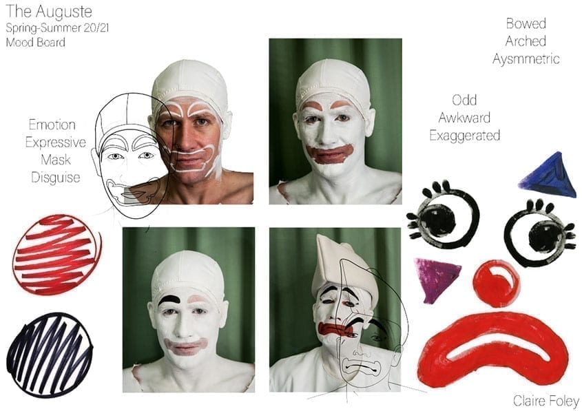 Silhouette of the garments is influenced mainly by the facial features of the auguste clown make up such as the large rounded mouth and nose. The traditional oversized, baggy, relaxed fit of the clown’s costume informed the silhouette.