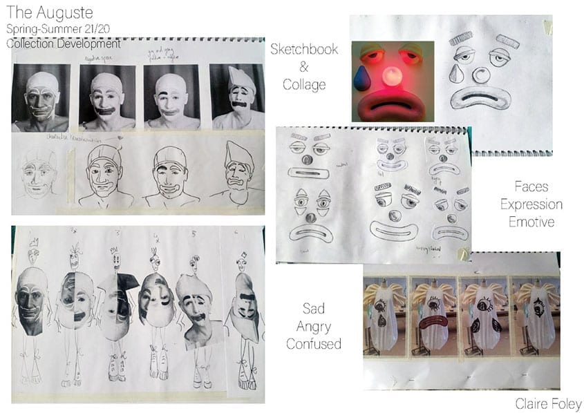 My collection takes inspiration from a classic horror film trope “the evil clown”. Seen in many films such as “it” and “killer clowns from outer space”. In my research I looked at how the happy joyous figure of the traditional figure of a clown has changed over time to something much darker.  This also aligns with the concept of transformation and getting into character. This led me to look at the process of putting on the makeup and costume.