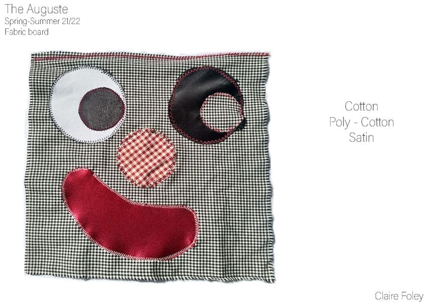 Using a black, grey, white and red colour palette because of the nature of the old photographs I was looking at during my research. The colour black is often associated with fear and death. The dark red colour came from the clown’s features such as their mouth and nose. Red is also a symbol of aggression, anger, and danger. The half and half nature of the fabric placement again follows this side by side changing nature of the clown. Regards to prints I have incorporated large polka dots a traditional print associated with clowns