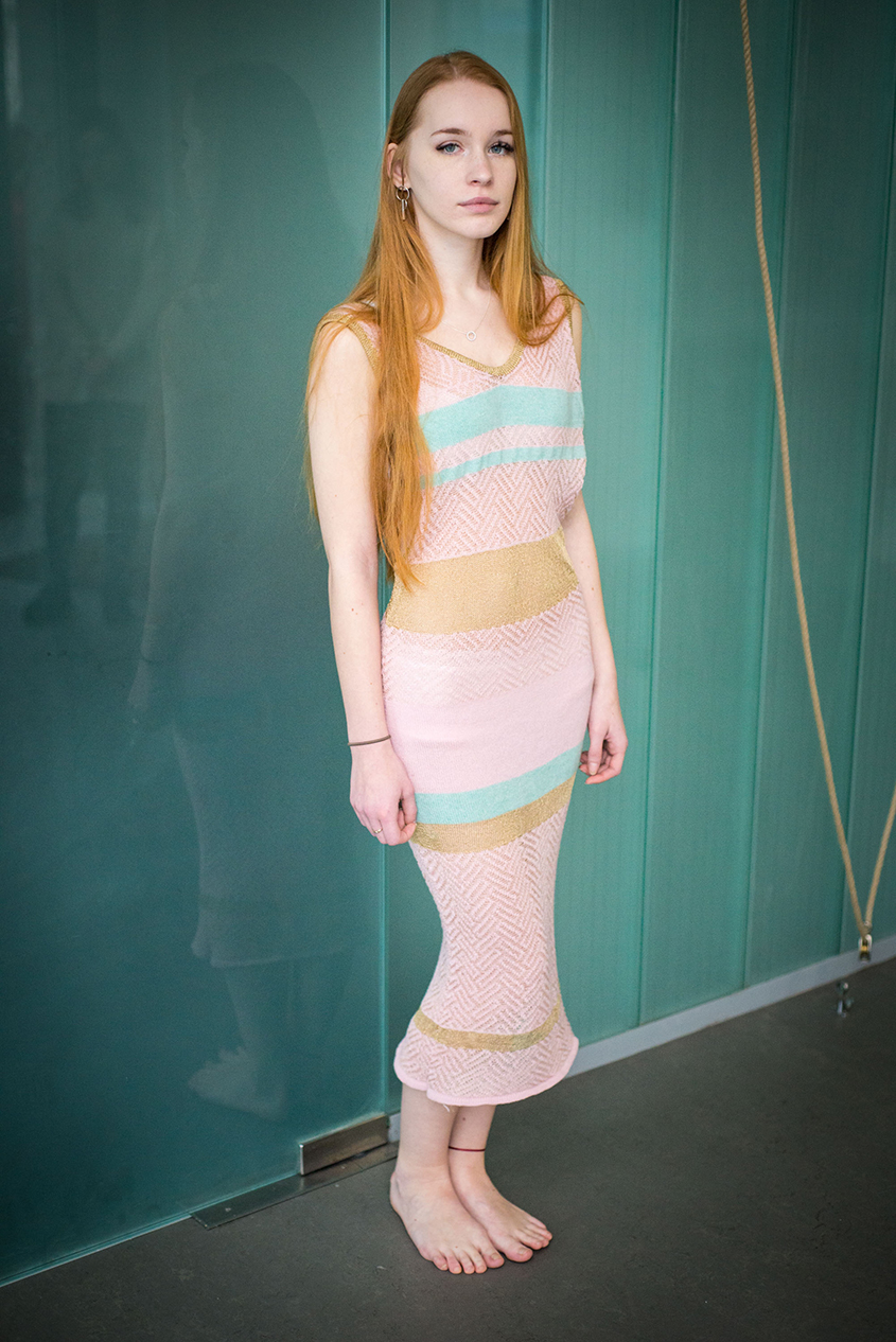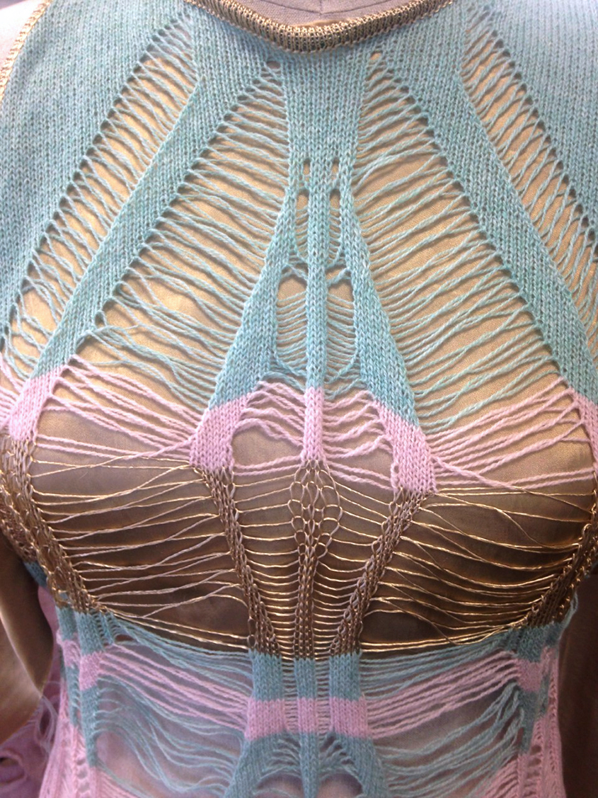 My collection is influenced by 18th century Palaces in Berlin. The interior is full of lavish decoration in Baroque and Rococo style. I was drawn to the pastel colours found throughout each palace. Gold was also a predominant colour which caught my eye. I wanted to translate the luxury elegance of the Palace into fashion. I was inspired by the architecture and lines which I translated into knit structures. I created my garments on a hand flat domestic knitting machine which allowed me to have full control over each textile. My work is defined by delicate textiles with a focus on soft colours with an accent of gold. My collection includes a combination of different lace structures and textiles. Each garment is made with 100% lambs-wool and viscose.