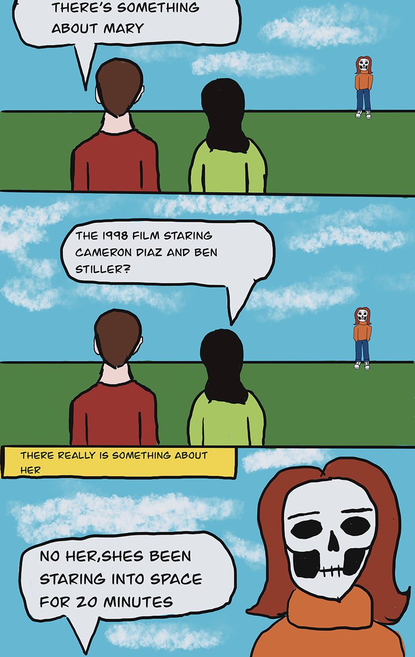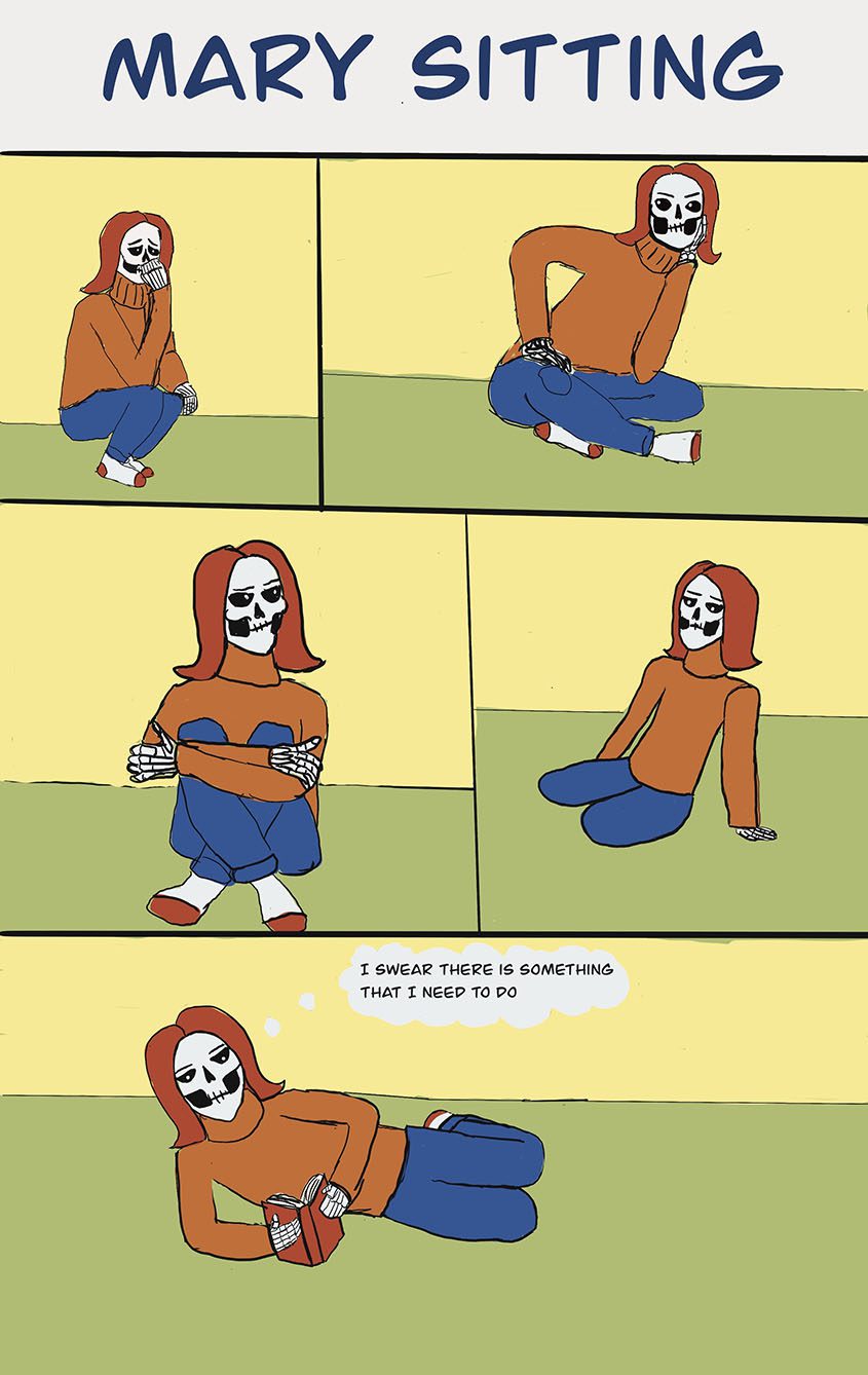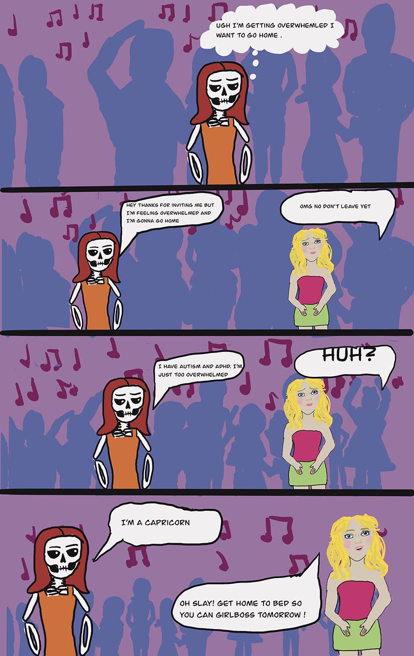 The artist is exploring their neurodivergence through a character they created, a skeleton called Mary Ní Creatlach. Mary being a skeleton makes her stand out as different between other characters in the comics, which is a major theme. They are showing the experience of woman getting a diagnosis in adulthood. Dark humour and absurdity are used in the comics to make light of difficult situations which the artist has experienced. The artist has created this work using Procreate to create digitally printed comics, posters and riso poster zines.