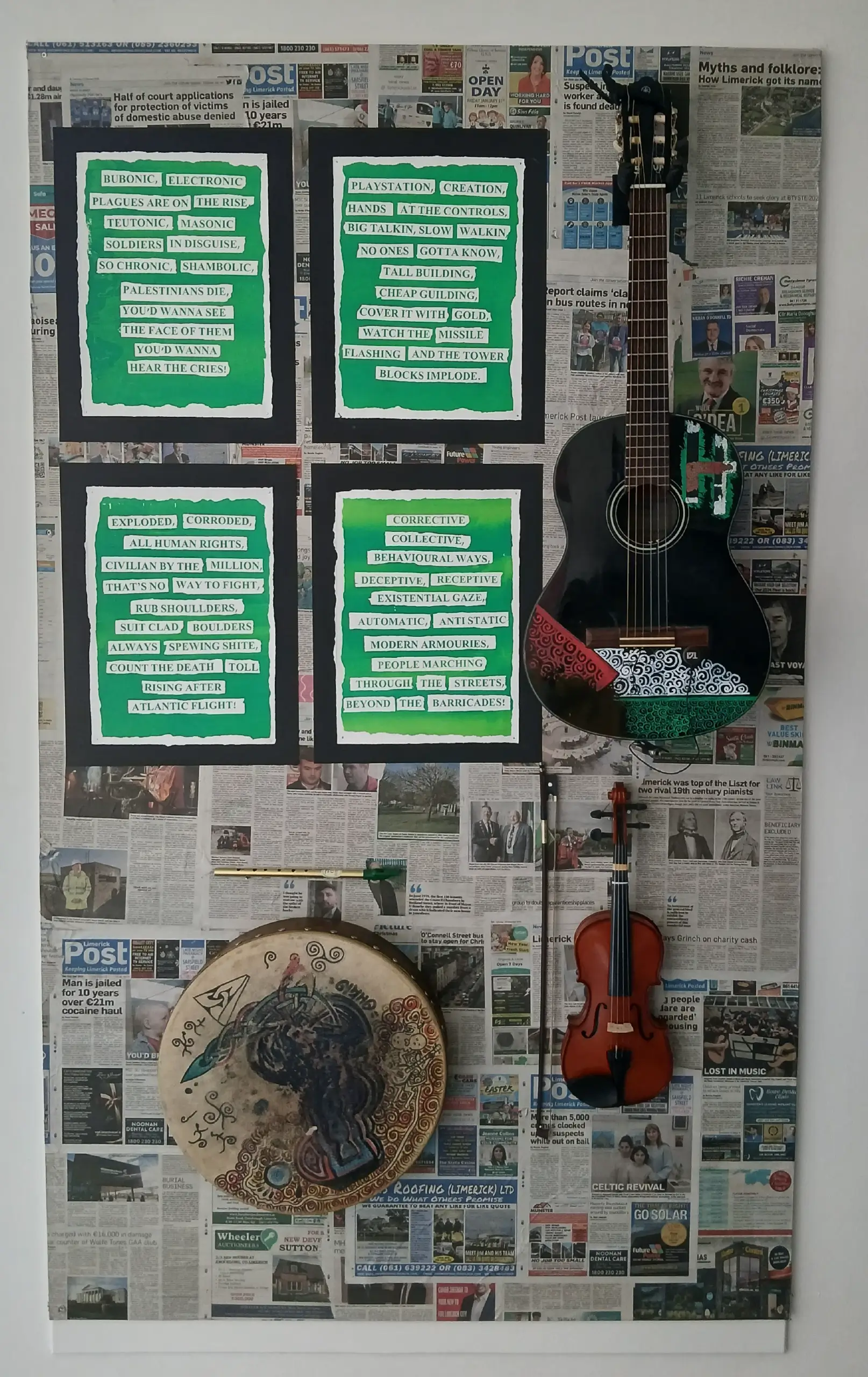 The title of the band and project ‘Major Feen’ combines a military rank with an Irish traveler term for a man which has made its way into the vernacular language of Limerick and other parts of Munster. This marks the art work with themes of militarism, masculinity and rebellion as well as a sense of the extraordinary.